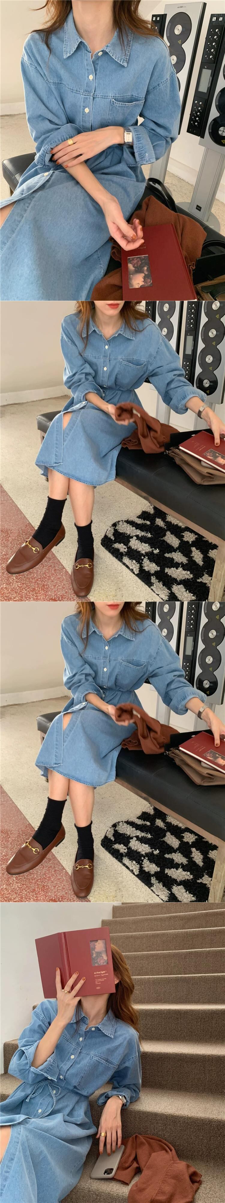 春バージョンのルーズネクタイウエスト長袖ダークブルーデニムドレス気質カジュアルミドル丈シャツスカート ロング スプリング 春物 cat854103450484