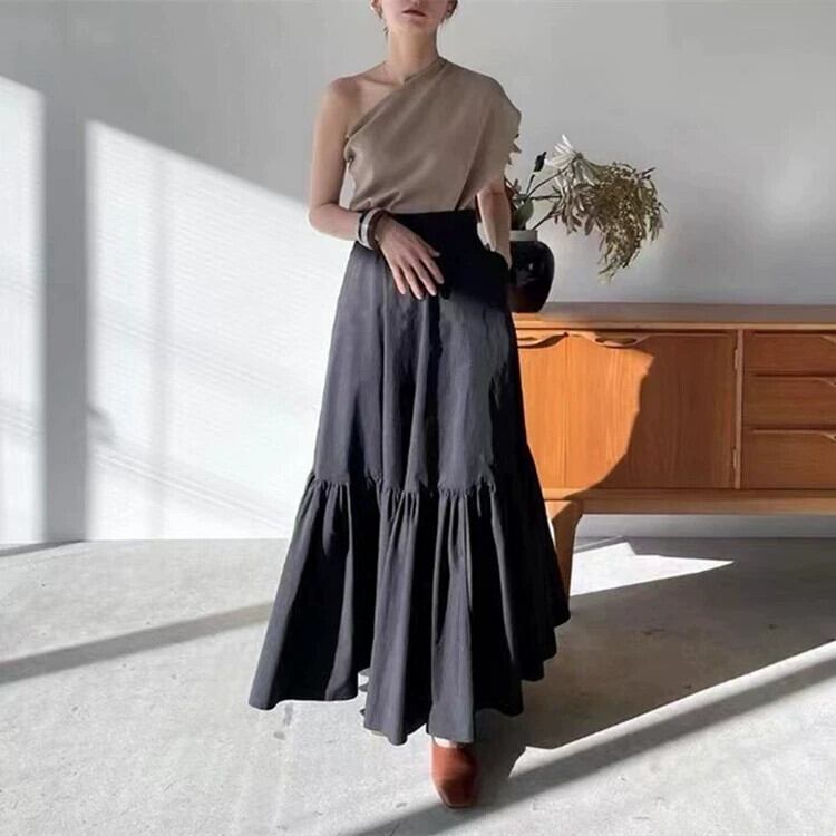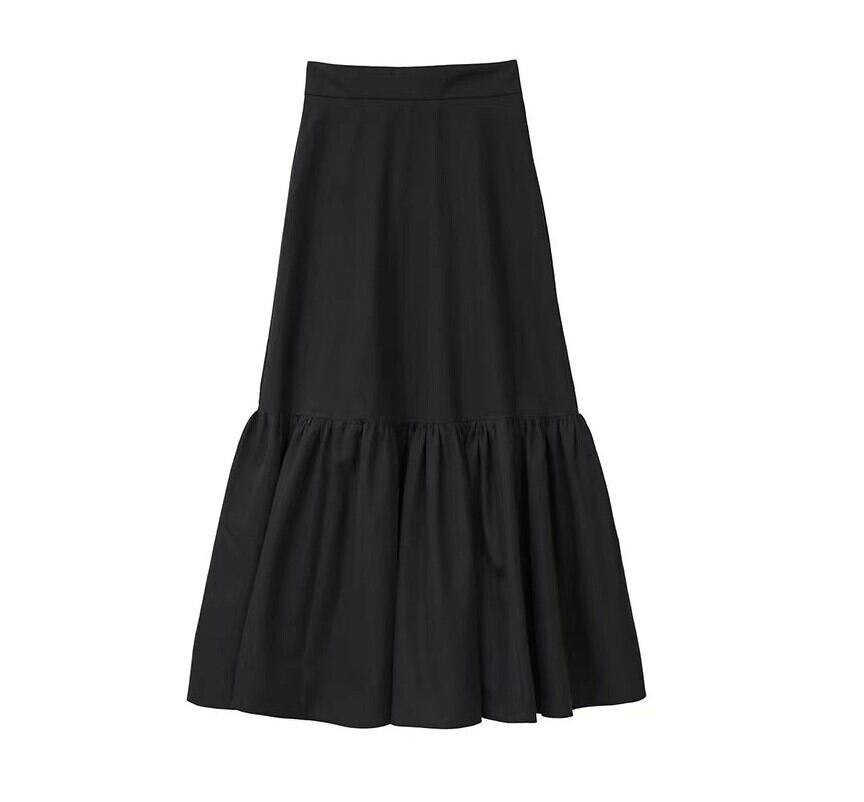 越境 2023 夏と南の新しいファンフリルハイウエスト無地ステッチロングスカート女性 A ラインスカート ハイウェスト ラッフル サマー 夏物 Aライン ソリッドカラー cat832413351758