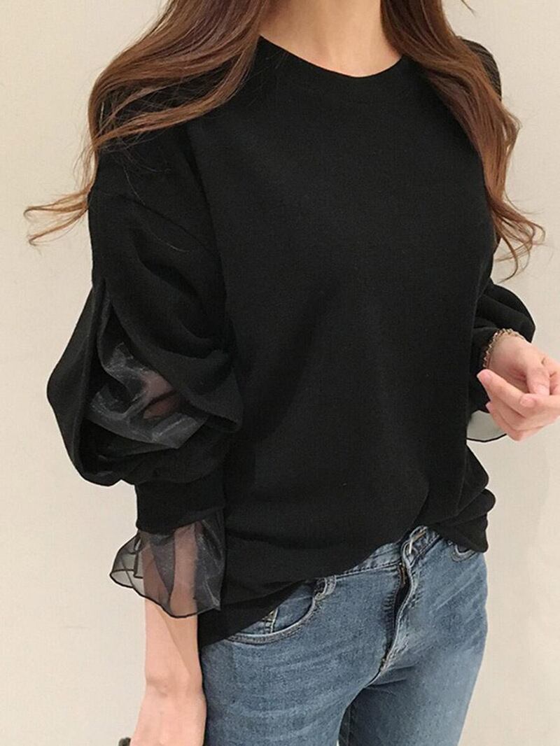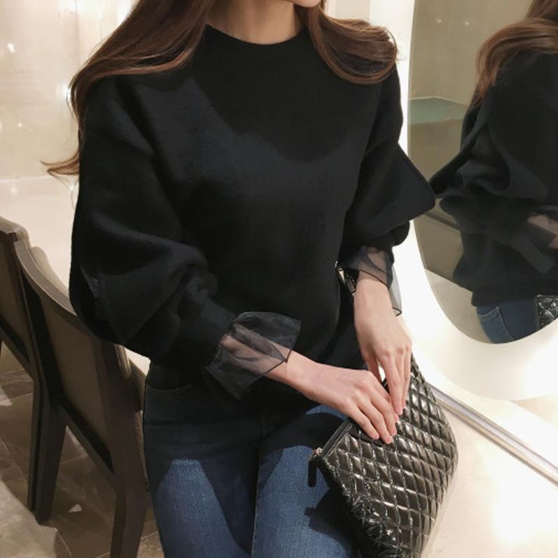 2022年版のレディースセーターシースルーメッシュステッチラグランスリーブ無地シンプルルーズオールマッチラウンドネックトップ Oネック ソリッドカラー cat886250877523