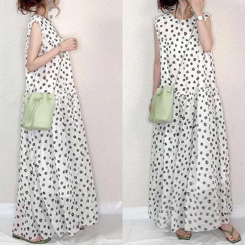 クロスボーダーこれらの夏の新しいプリントビッグスイングスリングラウンドネックステッチボヘミアンルーズノースリーブシフォンドレス サマー 夏物 Oネック cat895506645439