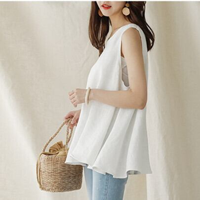 ese とラウンドネック A ラインスリーブヘッドは薄くて大きなスイングノースリーブスカートシャツ 2022 夏新ベルトウエスト気質コットンリネンシャツ ハーネス Oネック Aライン cat84809803304