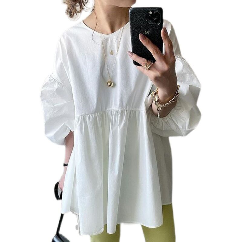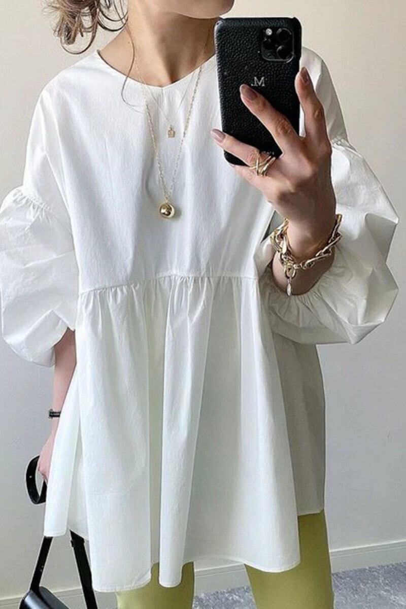 ese eign trade ランタン袖緩い大きいサイズのシャツ春と夏の新しい気質文学的で芸術的な無地フリル白シャツ女性 ホワイト ランタンスリーブ 大きめサイズ スプリング 春物 サマー 夏物 ソリッドカラー cat874287472362