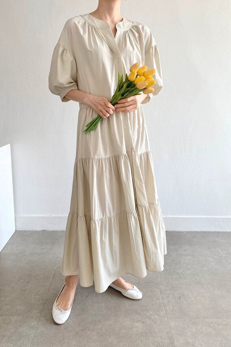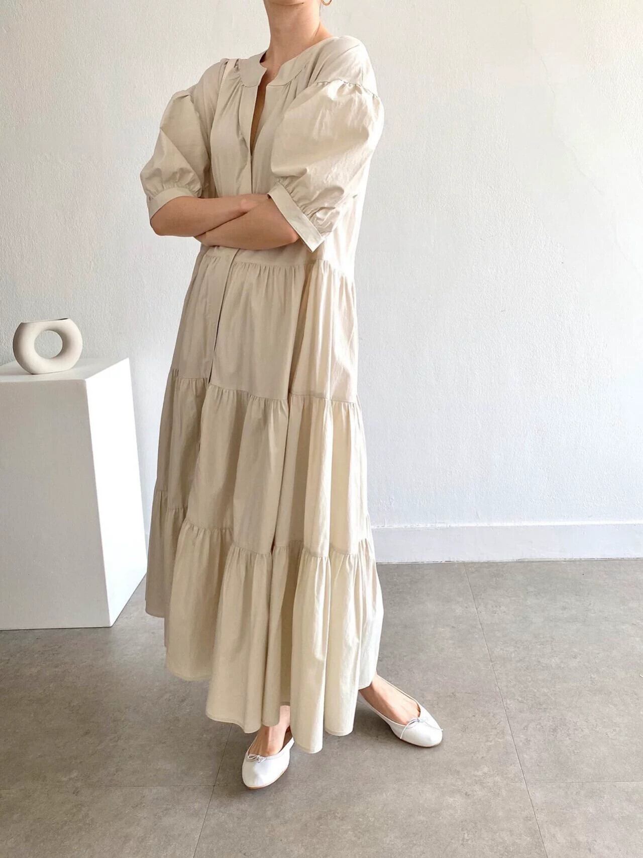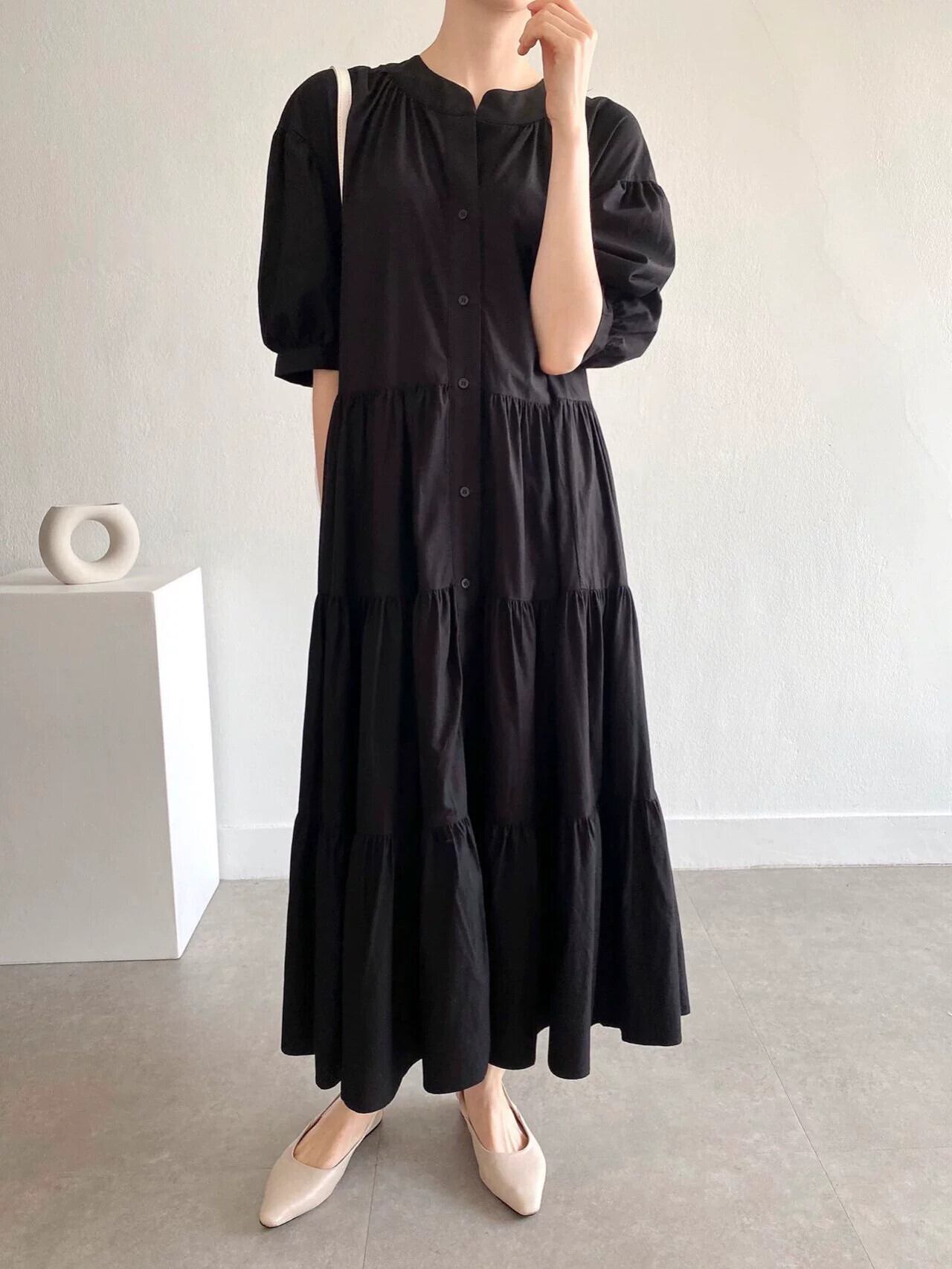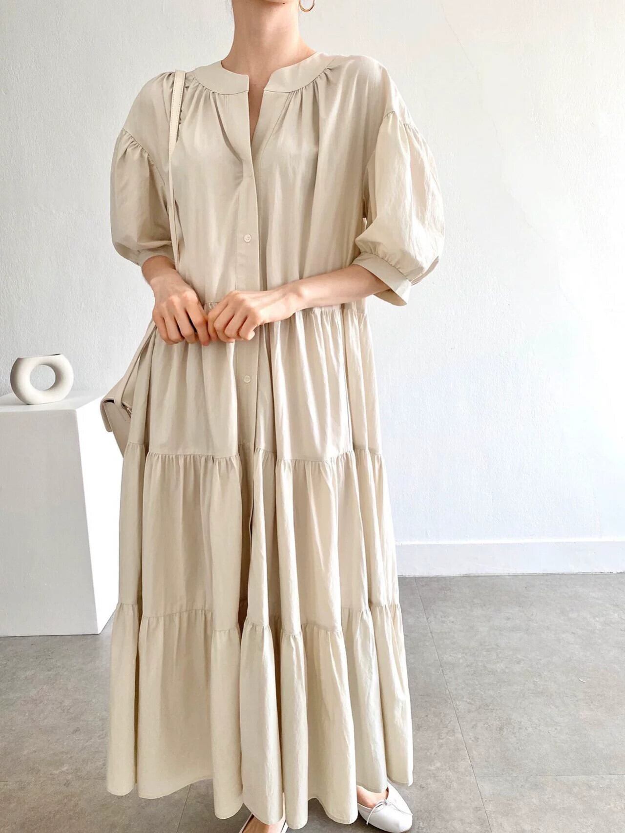 シックなフレンチラウンドネックパフスリーブケーキスカートルーズ大きいサイズシングルブレストロング半袖ドレス女性 大きめサイズ Oネック cat872583806928