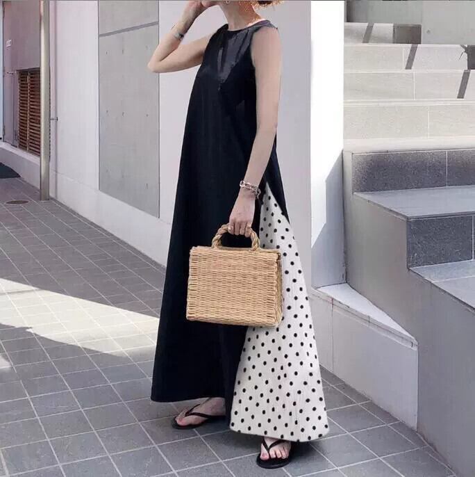 越境 2022 新しい ese 気質通勤裾スプライシング水玉ノースリーブドレス黒ベストロングスカート女性 ブラック cat838699192707