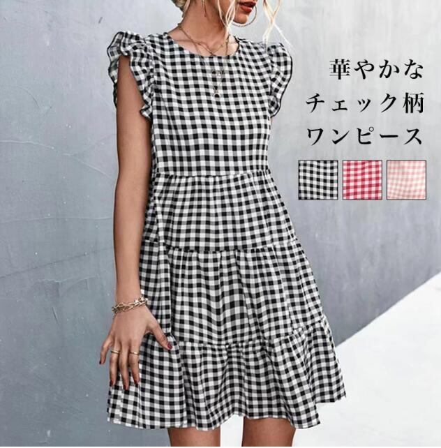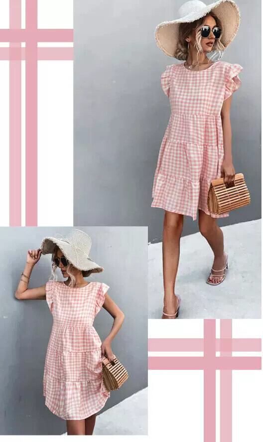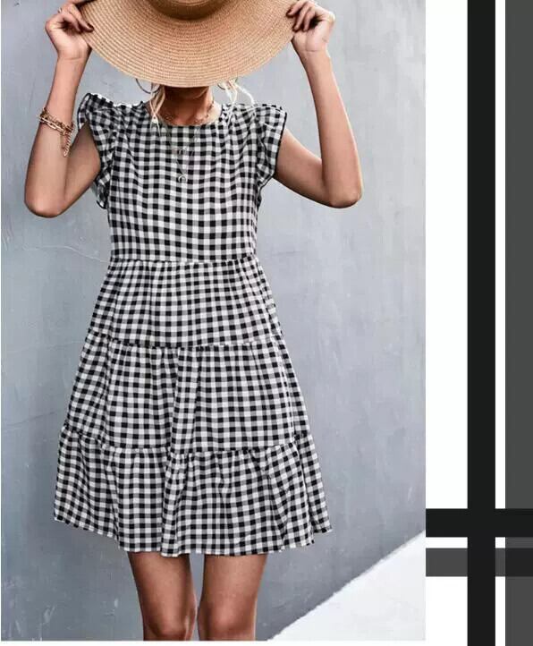 越境アマゾン2023夏新バージョンチェック柄フライングスリーブ甘くて可愛いラウンドネックドレスミニスカート 大人ガーリー スウィート キュート カジュアル サマー 夏物 Oネック cat83253653476