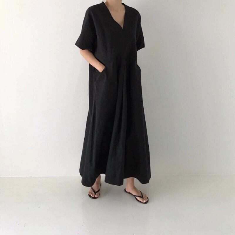 南夏のストリートルーズレイジービッグポケットレトロリネンVネックドレス サマー 夏物 cat849273199293