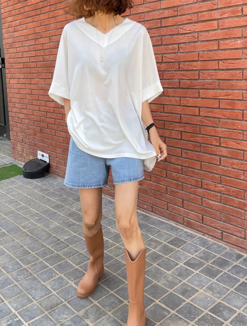 2023 ese 夏の新婦人服ルーズで薄い無地フロントとリアダブル V ネックバットスリーブトップ Tシャツ女性 サマー 夏物 Vネック ソリッドカラー cat878224213093