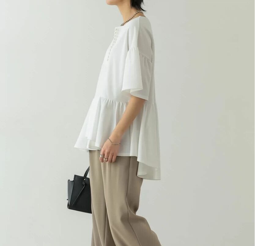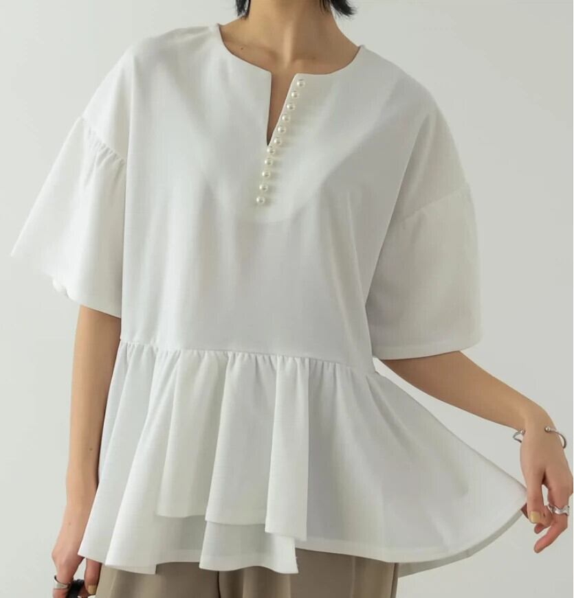 越境 2023 夏の新気質シャツパール装飾 V ネック不規則なルーズトップ女性 サマー 夏物 Vネック 真珠 cat875674400738