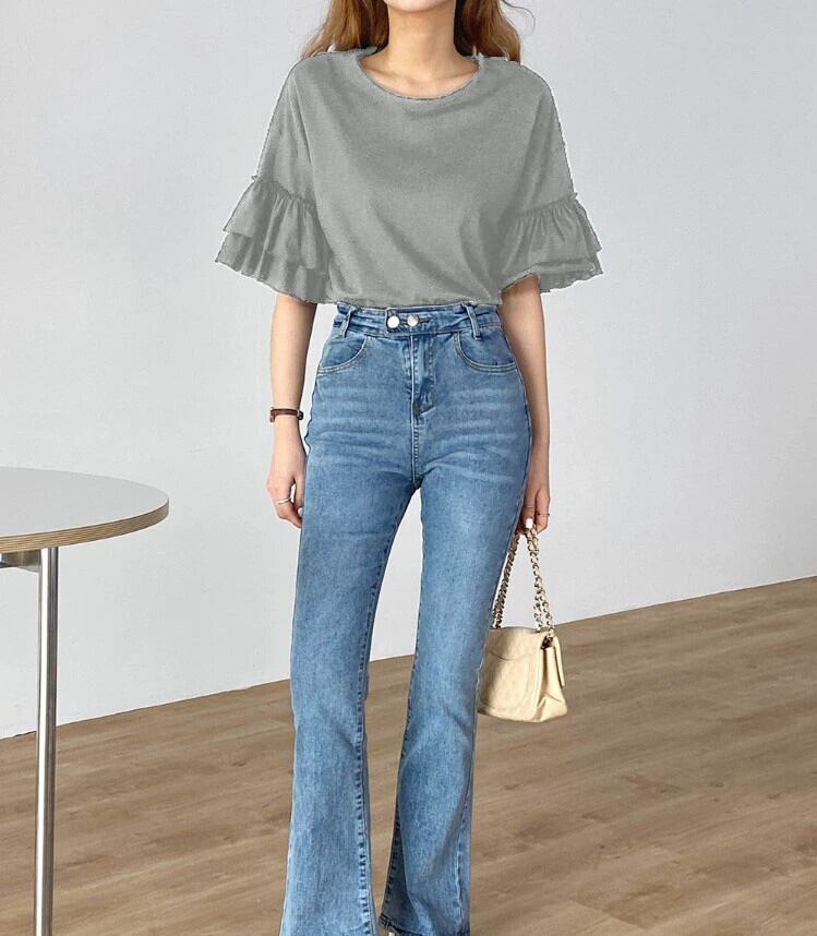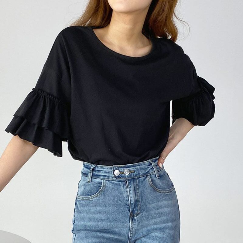 スタイルスポットレイヤードスリーブTシャツトップレディースDH新しいフリル半袖ルーズスリミングオールマッチソリッドカラー レッド ラッフル cat875824140359
