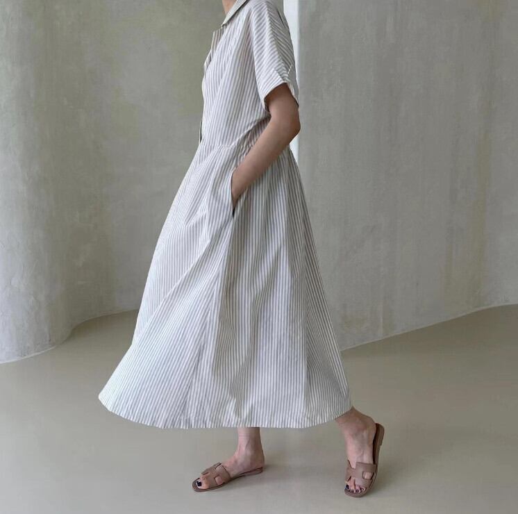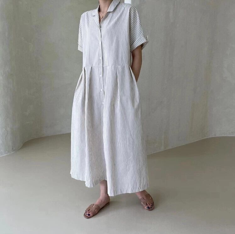 レトロなストライプの年齢軽減ロングオールマッチルーズフィットドレス cat838504187668