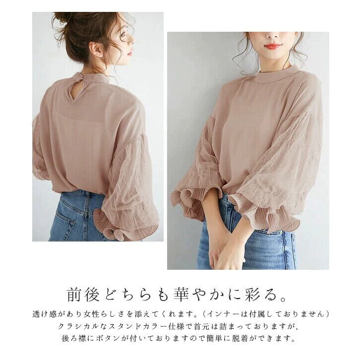 2023 ハンシャオスタンドアップカラーレースステッチ蓮の葉スリーブ無地シャツ女性の春と夏の新しい緩い大きいサイズオールマッチトップ 大きめサイズ スプリング 春物 サマー 夏物 ソリッドカラー cat849873626732