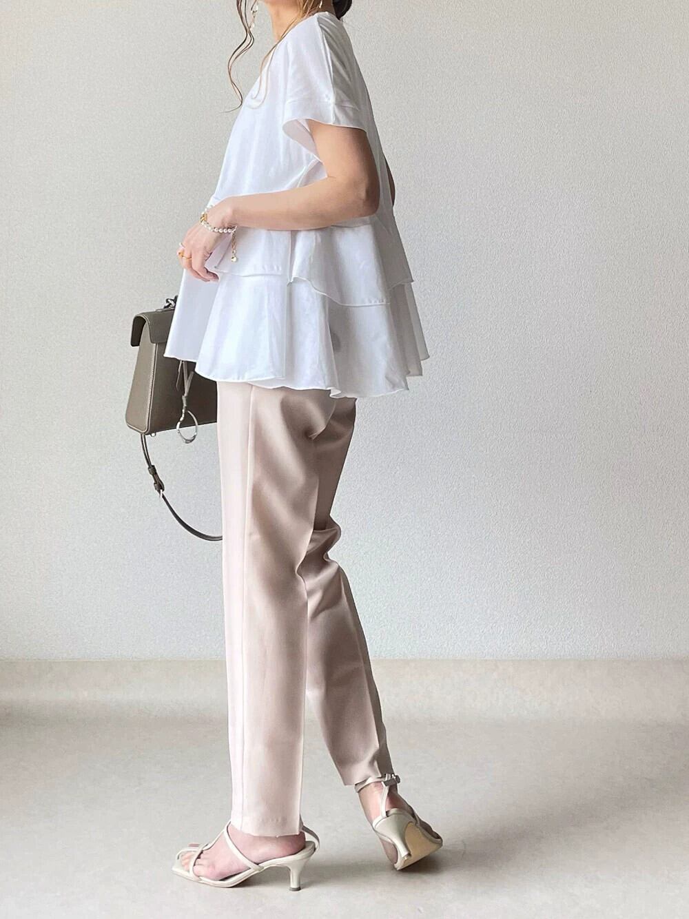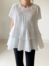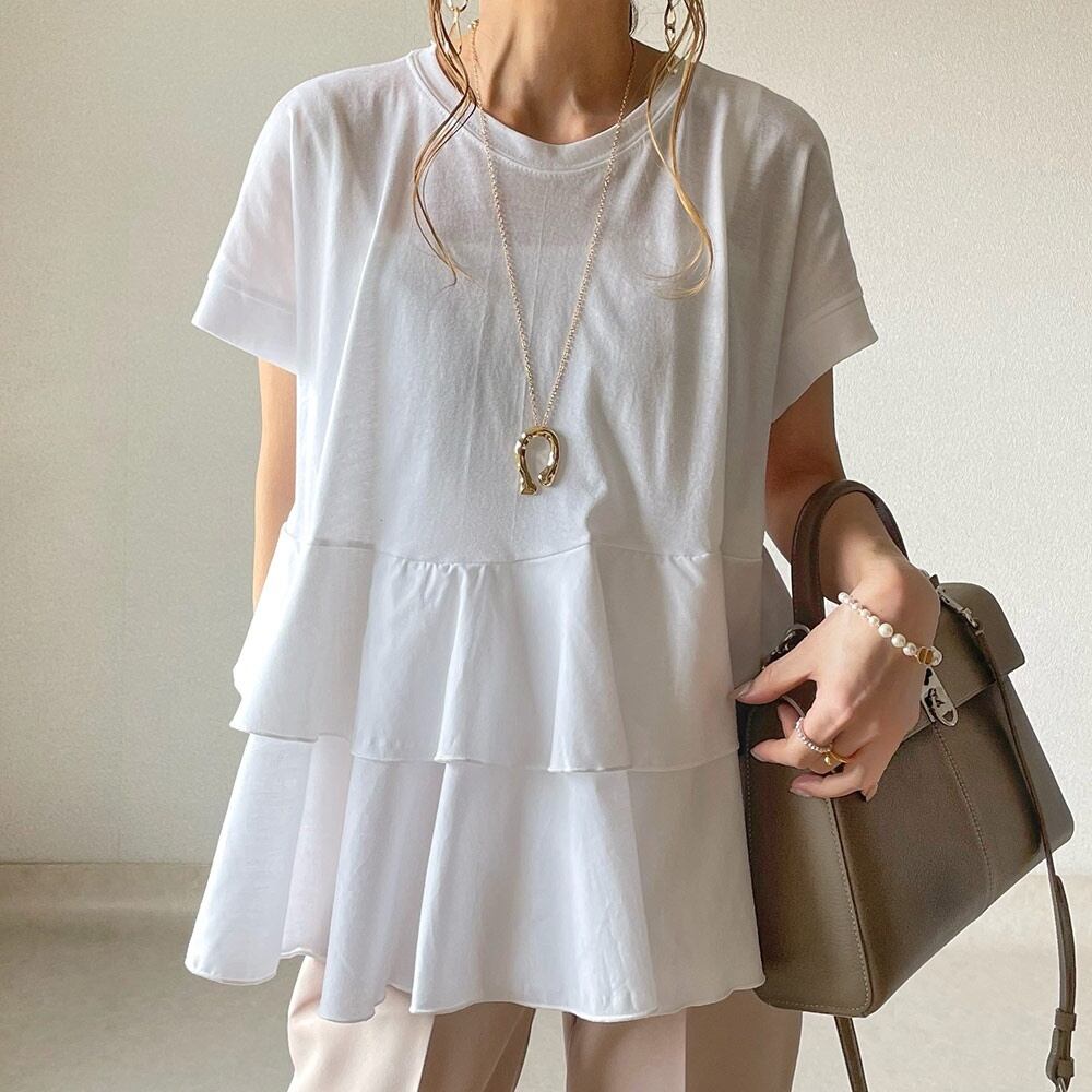 2023年夏の新作婦人服、レイヤードふわふわデザイン、フリル半袖ラウンドネックTシャツ、無地トップ レッド サマー 夏物 Oネック cat869936536567