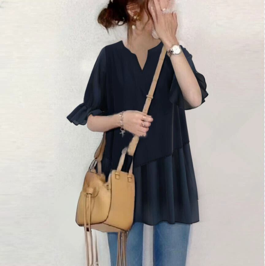 越境エサ夏婦人服シンプルな気質シフォンフェイクツーピースシャツ女性の気質vネックオールマッチカジュアルトップス サマー 夏物 cat882034587930
