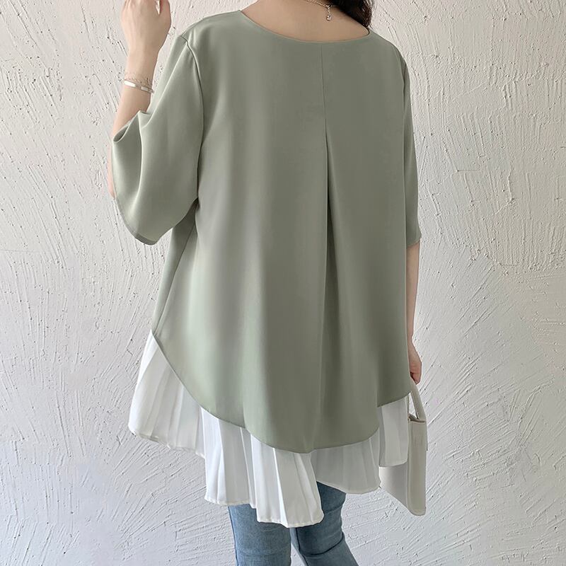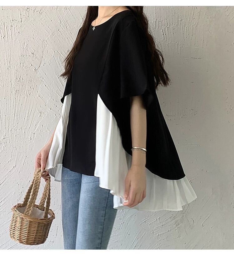クロスボーダー ese とルーズ スイート ヘム ステッチ プリーツ半袖シフォン シャツ レディース 夏の新しい不規則なトップス 大人ガーリー スウィート キュート カジュアル サマー 夏物 cat896184707190