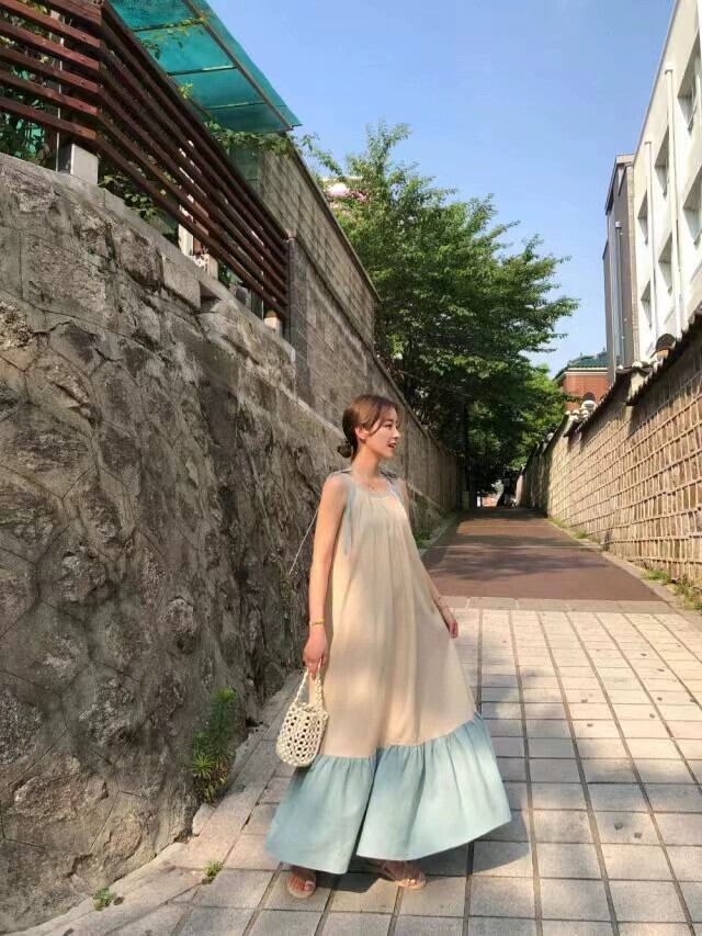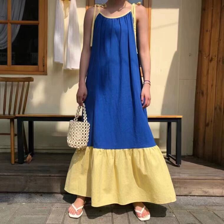 ミッドレングスノースリーブサスペンダードレス女性のスプライシングカラーマッチング痩身オールマッチロングスカート cat883861834611