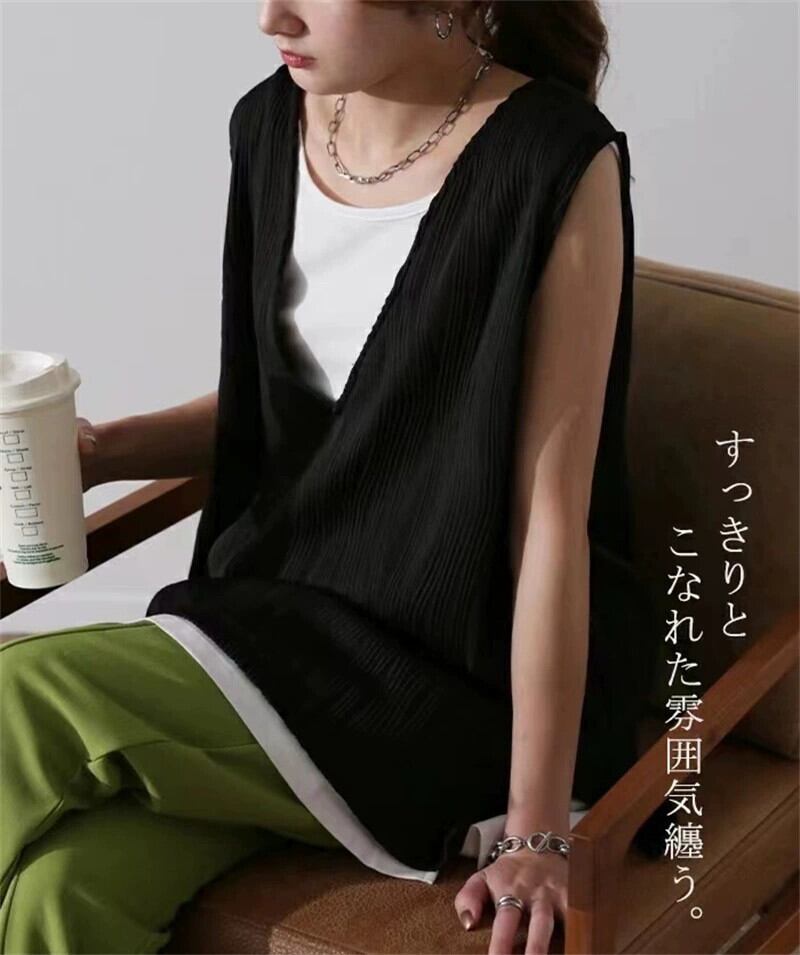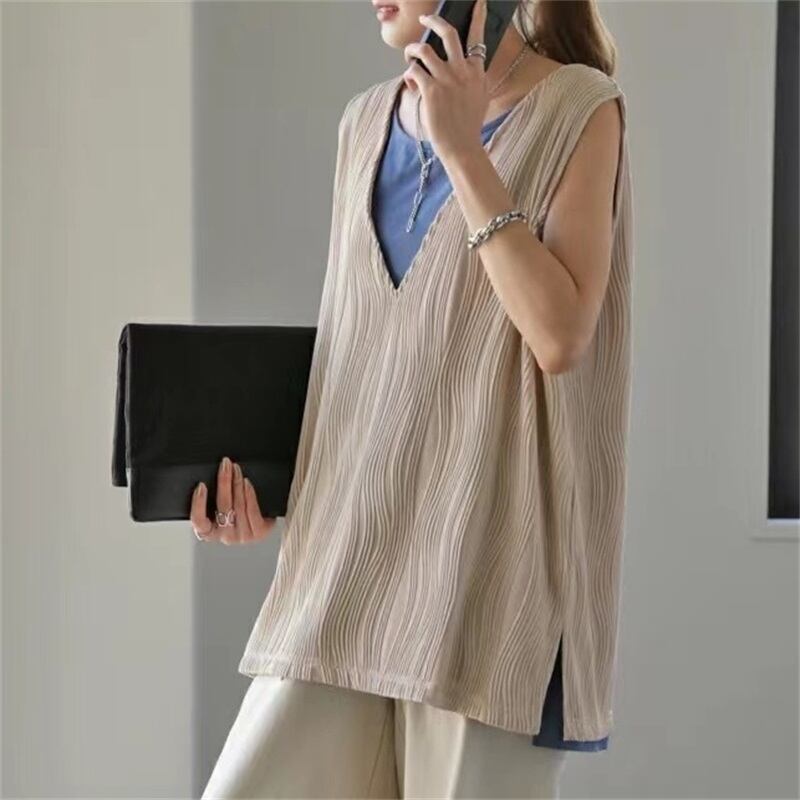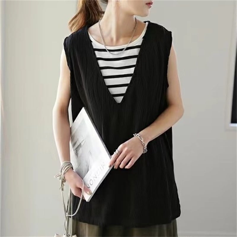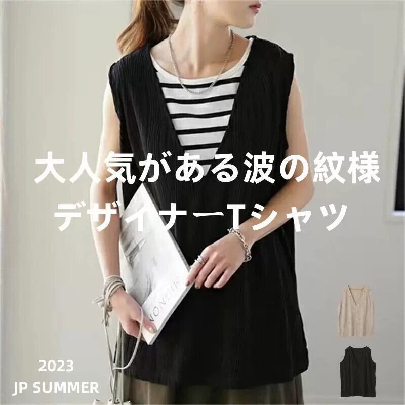 2023 夏の新しいスタイルの波ストライプロード V ネックノースリーブ無地トップ、両側にスリットがあり、オールマッチ T シャツレディース サマー 夏物 Vネック Tシャツ cat856227028235