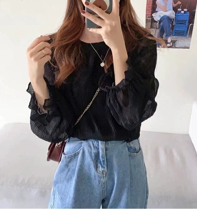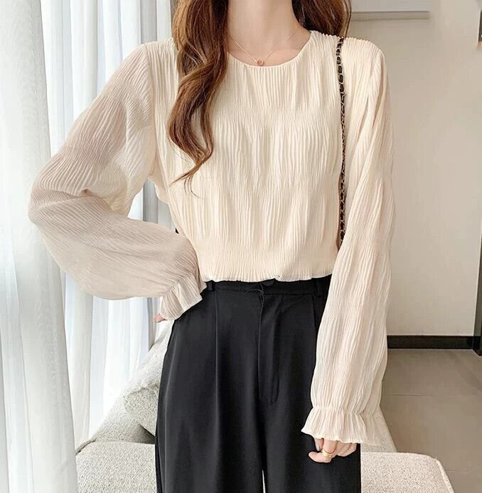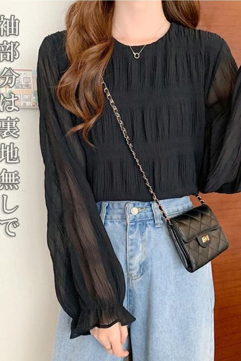 ロッテ・アインのシングルプレスプリーツトランペットスリーブシフォンシャツ、ゆったりと万能な長袖ウエスタンスタイルトップス、春、夏、秋 ロング スプリング 春物 サマー 夏物 オータム 秋物 cat837126665021