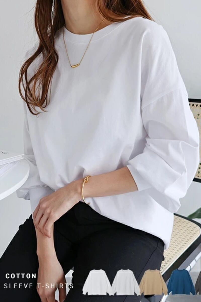2023 春の新 ese スタイル無地カジュアルルーズ薄いシンプルなラウンドネックボトリングシャツ長袖 tシャツ女性 ロング スプリング 春物 Oネック ソリッドカラー cat851361082079