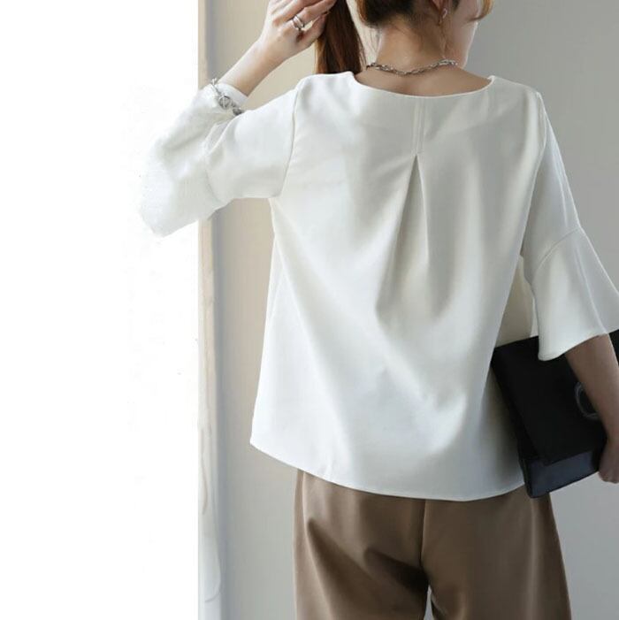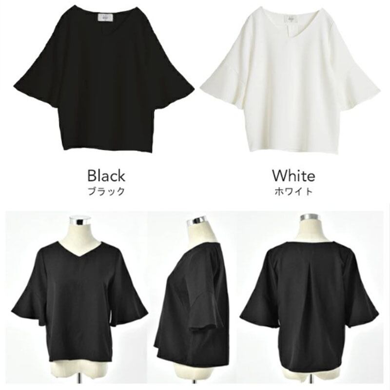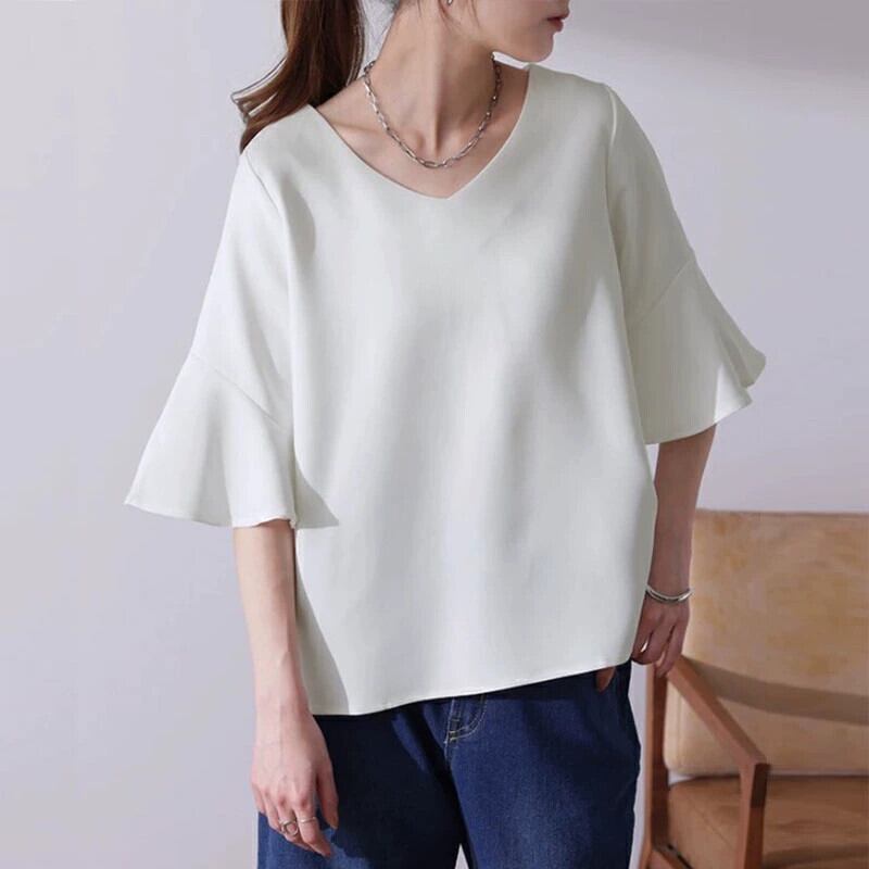 楽天の2023春夏新作スポット蓮の葉スリーブVネックルーズカジュアルトップスレディース半袖Tシャツ スプリング 春物 サマー 夏物 cat881617026252