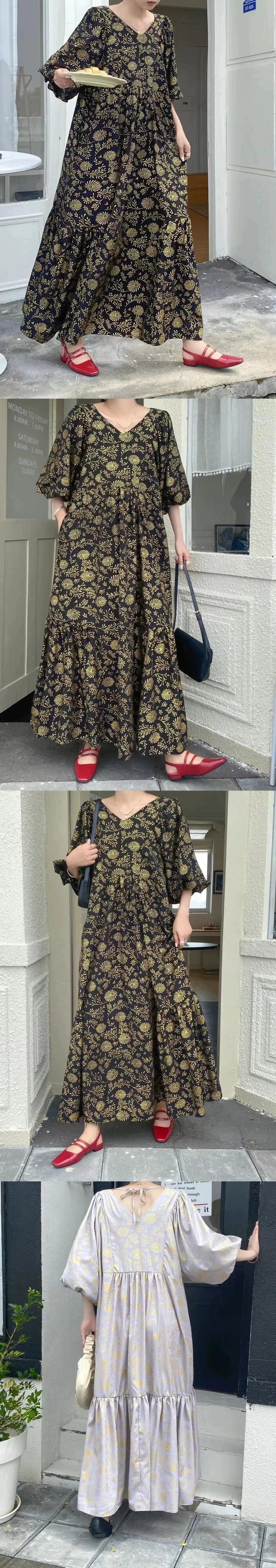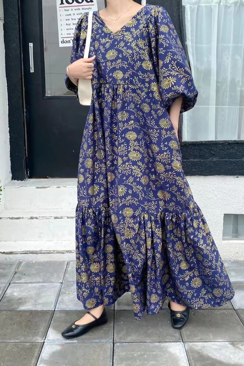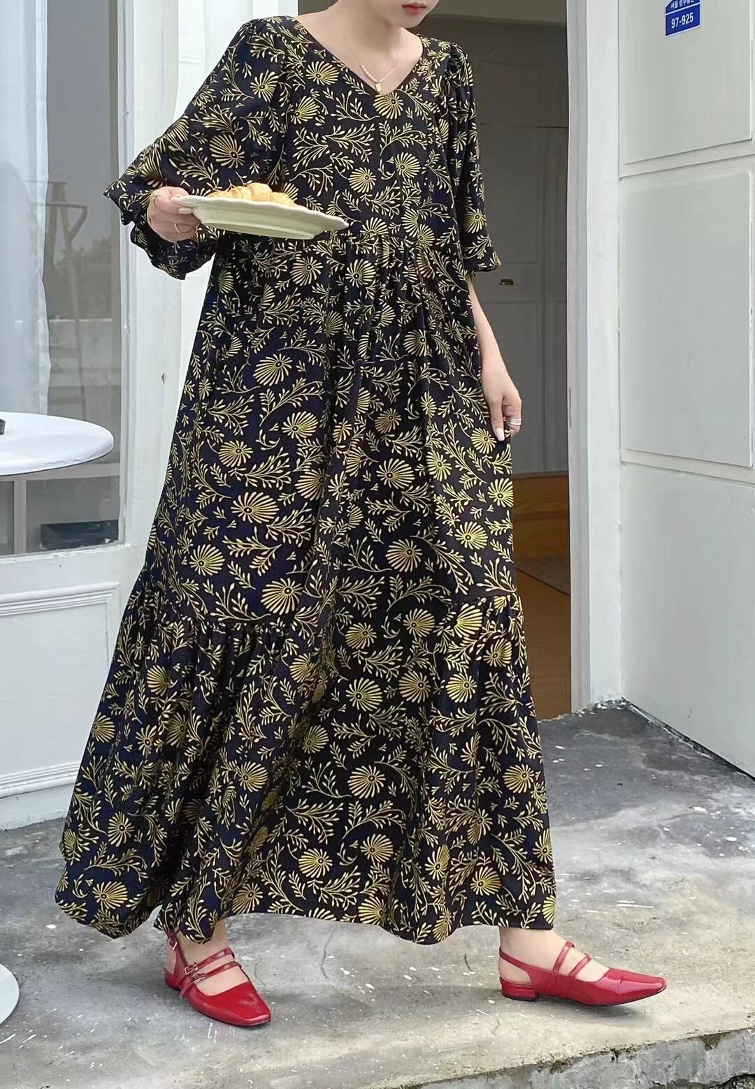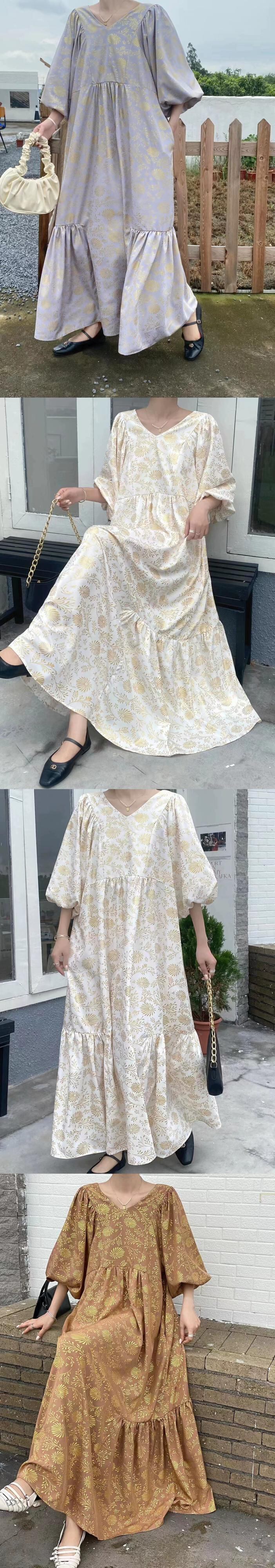 春夏バージョンの新しいファットMMゆったりとした大きいサイズで肉を覆い、薄いVネックのレトロなプリント気質を示すロングドレス 大きめサイズ スプリング 春物 サマー 夏物 cat846045713511