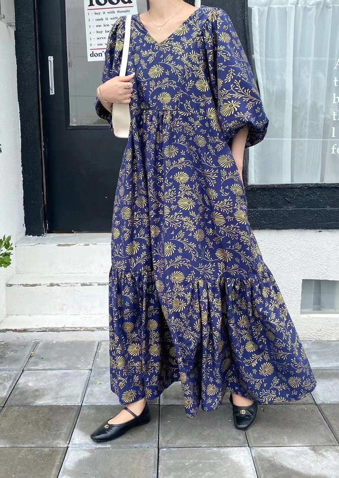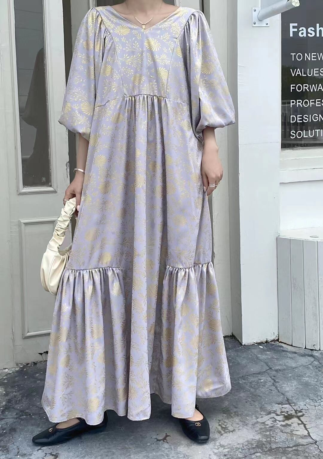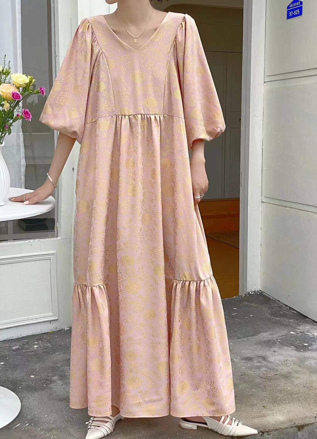 春夏バージョンの新しいファットMMゆったりとした大きいサイズで肉を覆い、薄いVネックのレトロなプリント気質を示すロングドレス 大きめサイズ スプリング 春物 サマー 夏物 cat846045713511