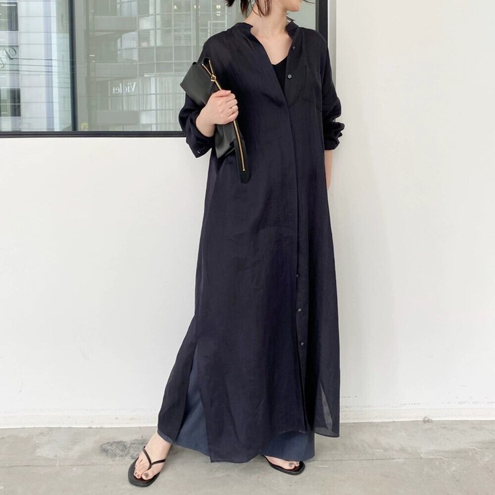 クロスボーダー ese とシャツドレスの女性 2021 春と秋の新無地リネンスタンドカラー長袖ルーズ薄手ドレス ロング スプリング 春物 オータム 秋物 ソリッドカラー cat882623100040