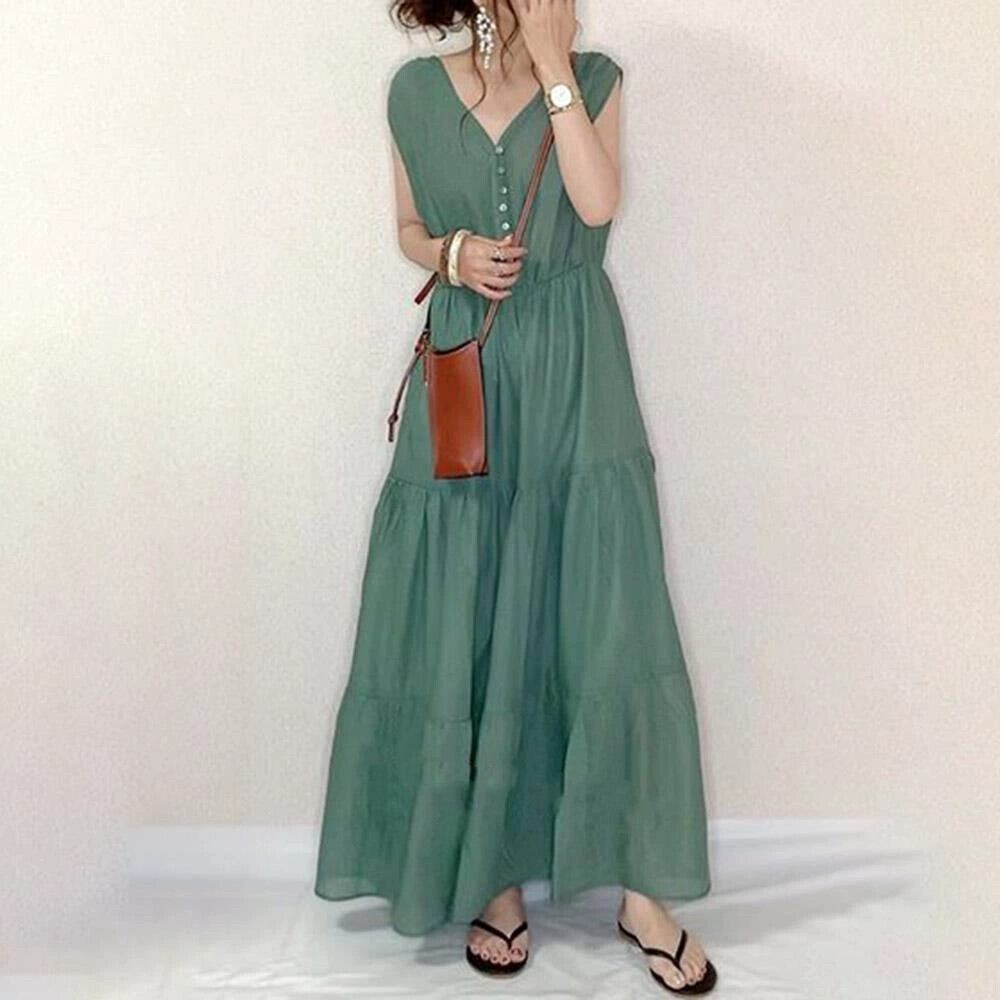 eign trade スタイル ese スタイル 2021 夏の新シンプルな V ネック無地ノースリーブステッチルーズビッグスイングドレスロングスカート サマー 夏物 Vネック ソリッドカラー cat890962282840