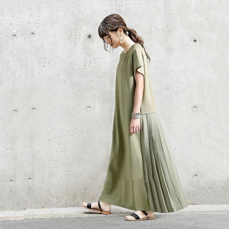 ese スタイル 2022 夏の新ソリッドカラー半袖コットンステッチプリーツビッグスイングルーズ気質ロングドレスレディース サマー 夏物 cat870279840527
