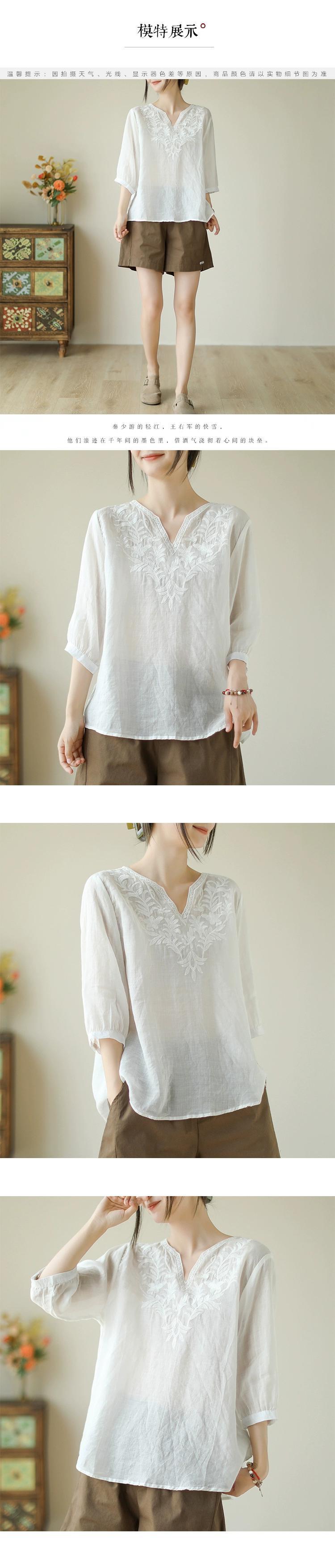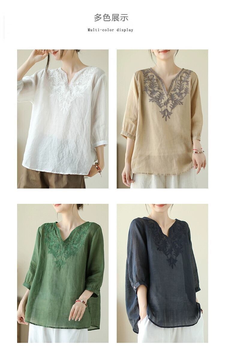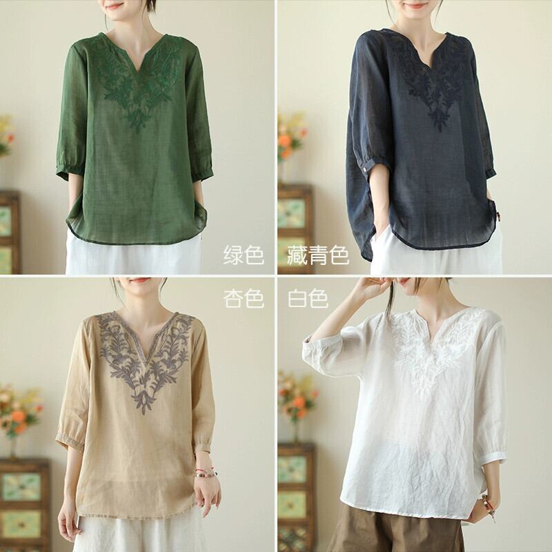 実物在庫の大きいサイズのコットンとリネンの半袖トップス、ゆったりとした細身の刺繍入りレトロシャツ レッド 大きめサイズ cat813099588424