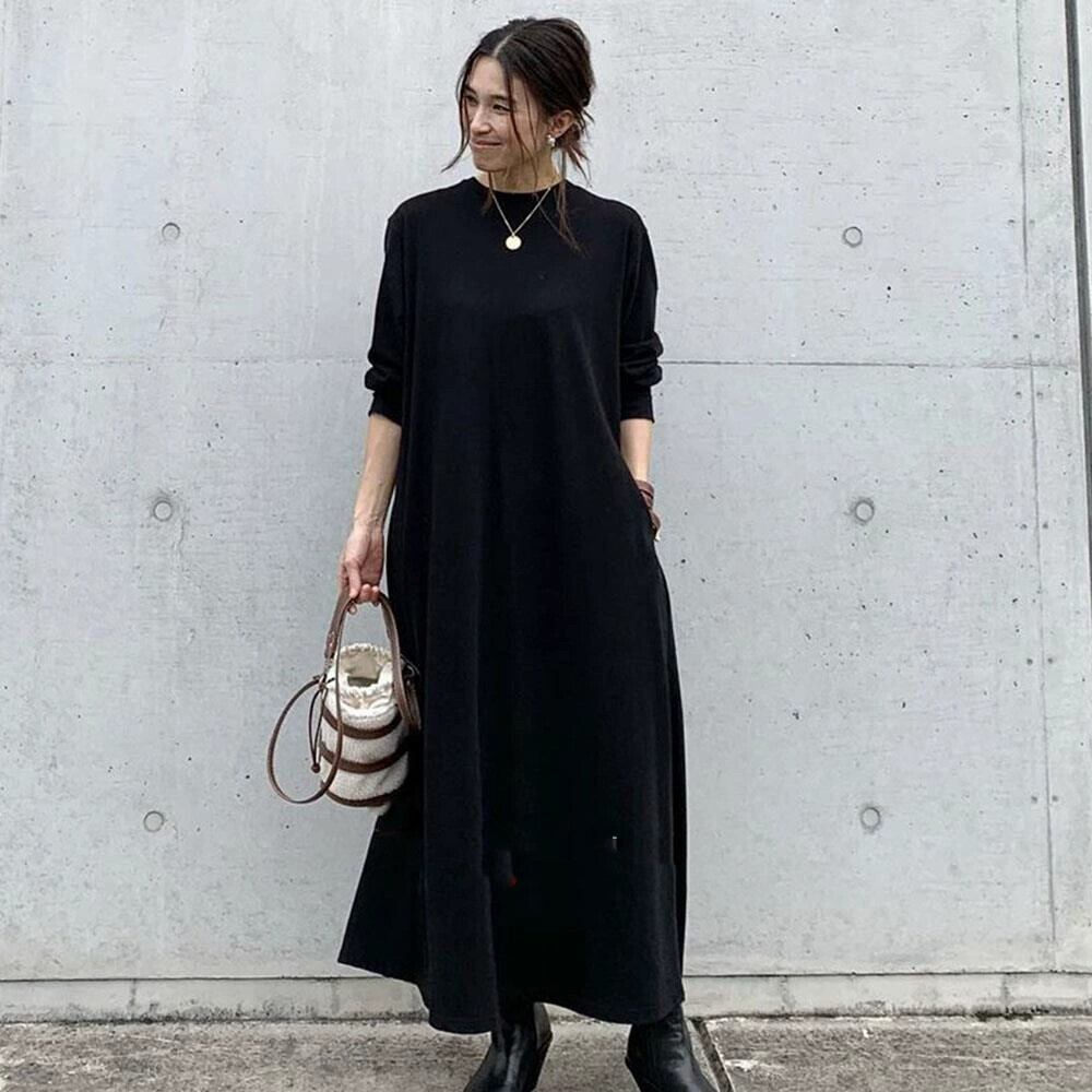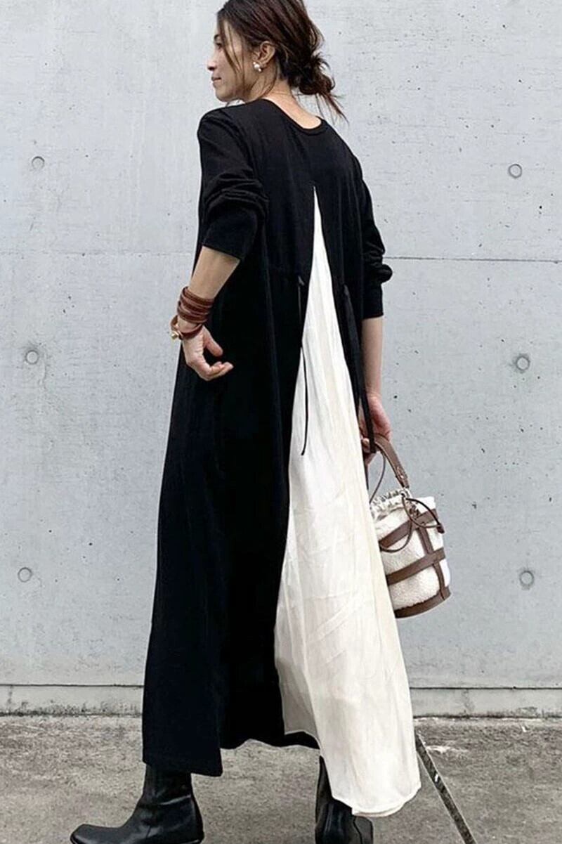 南の2021秋の気質ニッチバックコントラストカラースプライシングルーズウエストロングドレス長袖 オータム 秋物 cat831384784281