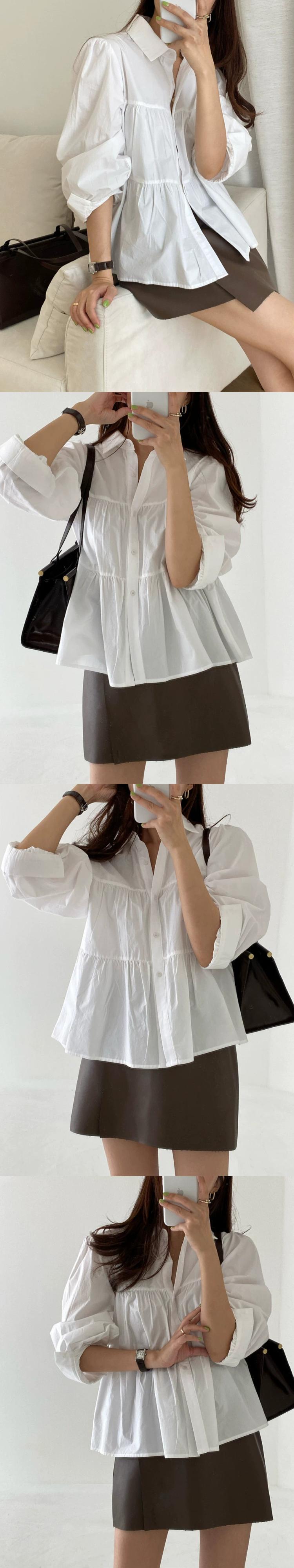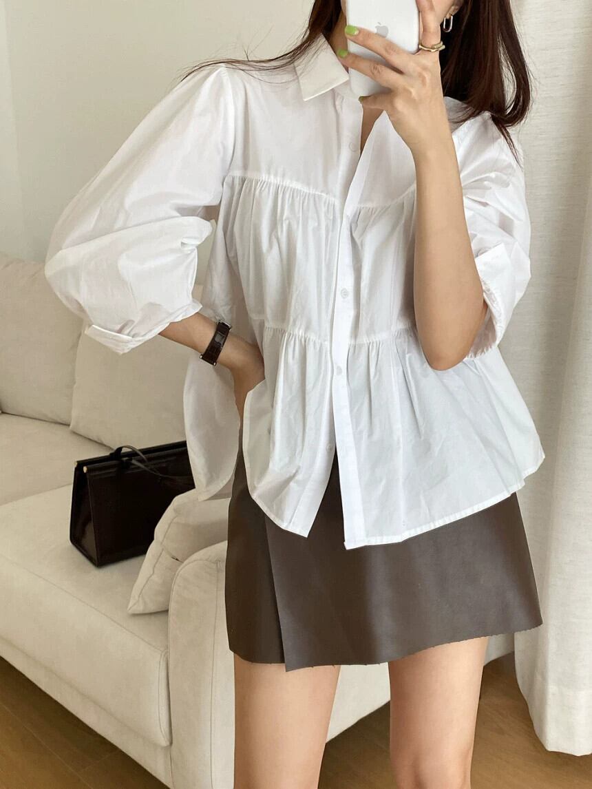 シックな新しいスタイルルーズプリーツパッチワークパフスリーブシャツ長袖トップドールシャツ女性 ロング cat81500211593