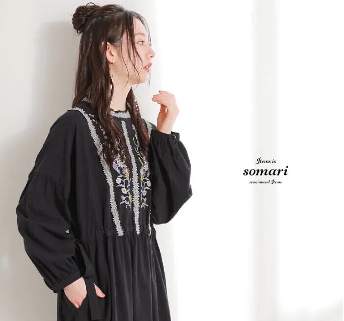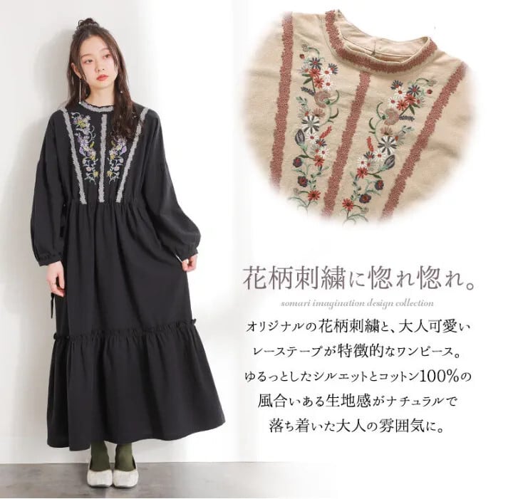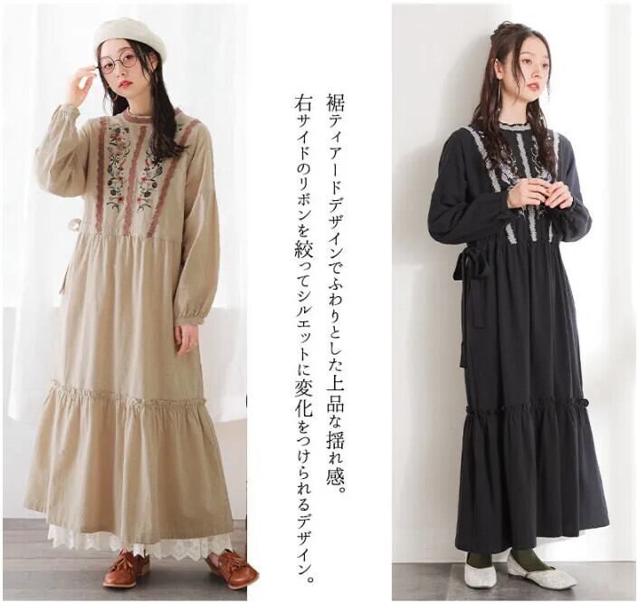 越境 ese ロッテ 2023 秋冬新しいレトロ刺繍カジュアル長袖綿麻ドレス ロング レッド コットン オータム 秋物 ウィンター 冬物 cat849504268118