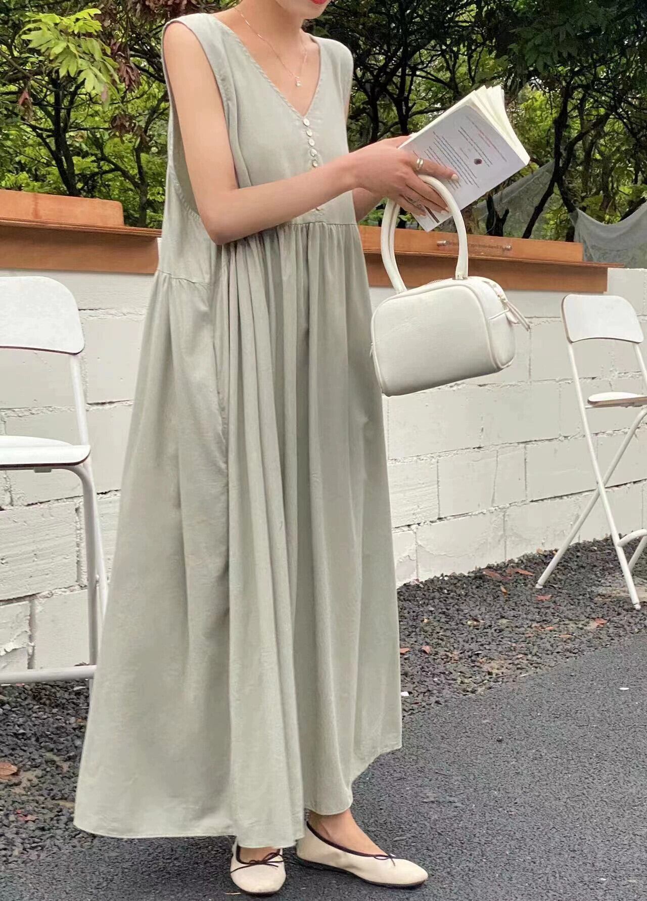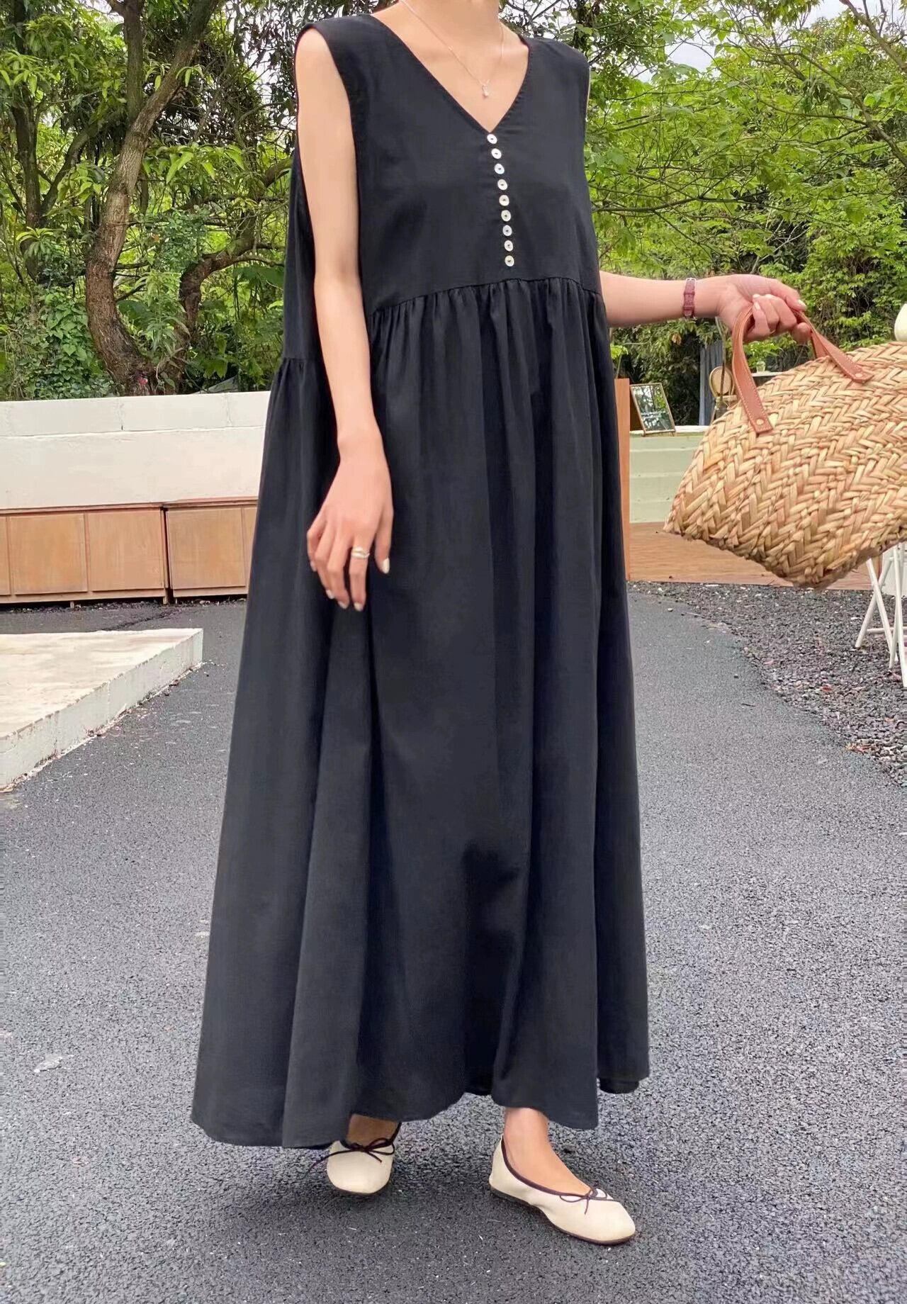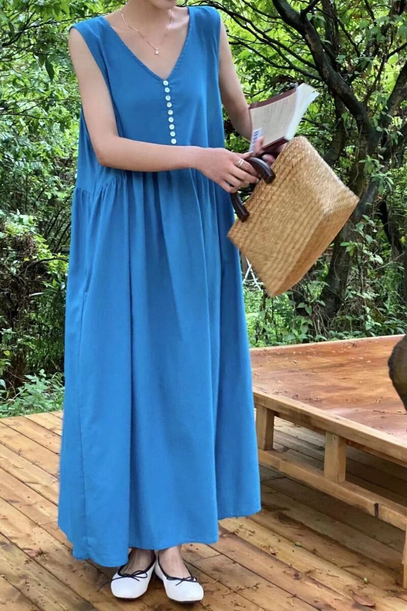 シックな夏の新しいスタイルフレンチボヘミアンスタイルレトロノースリーブvネックドレスロングベストドレス女性 サマー 夏物 cat873488231599