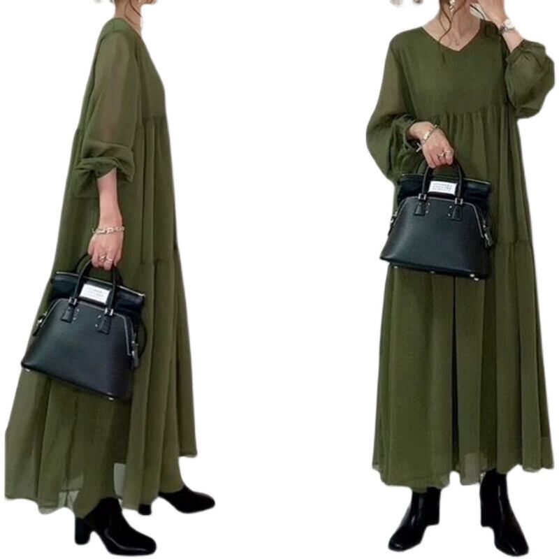ese越境新作秋ゆったり大きいサイズVネック長袖シフォンワンピースシンプル無地Aラインふくらみロングスカート 大きめサイズ オータム 秋物 ソリッドカラー cat829528846613