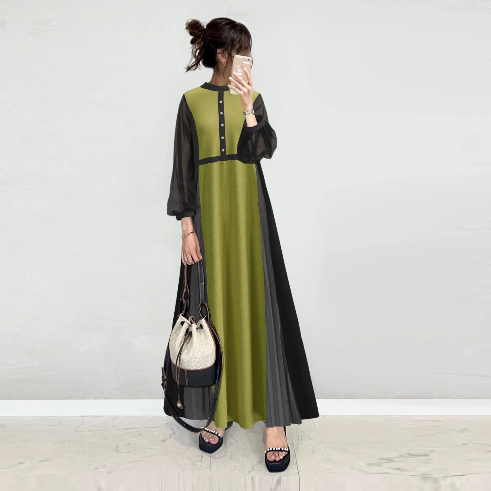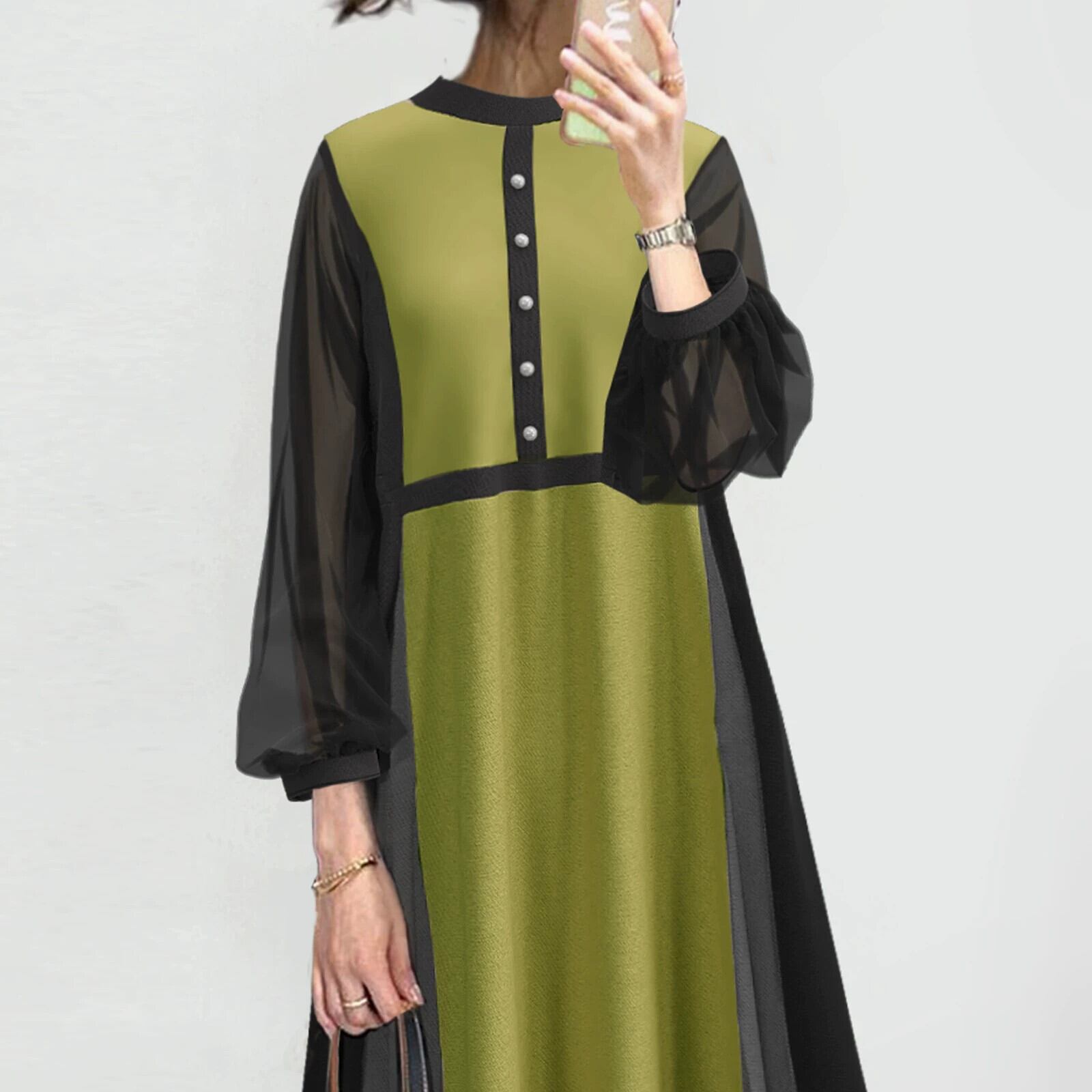 クロスボーダー ese 2023 秋の新スタイルラウンドネックパフスリーブミッドレングス袖弾性ウエストスプライシングドレス エラスティック 伸縮 オータム 秋物 Oネック cat811325703358