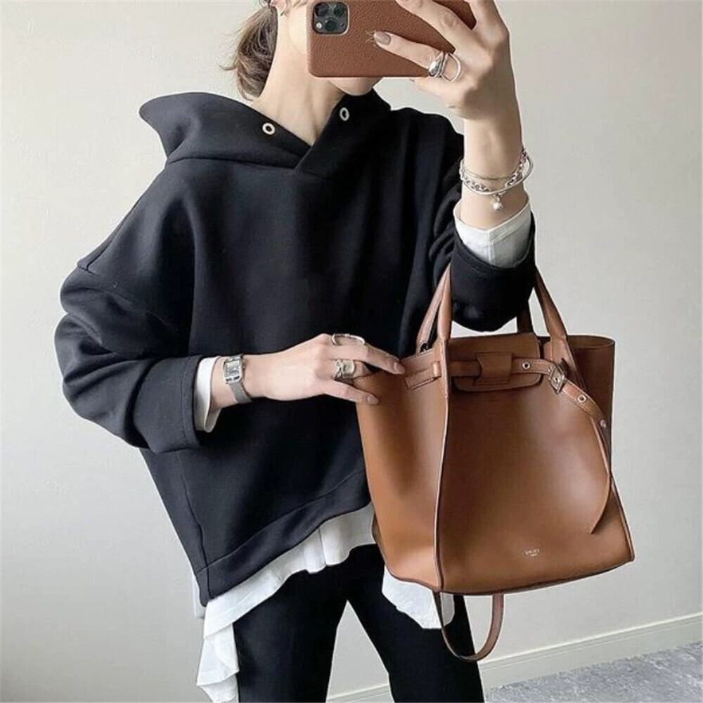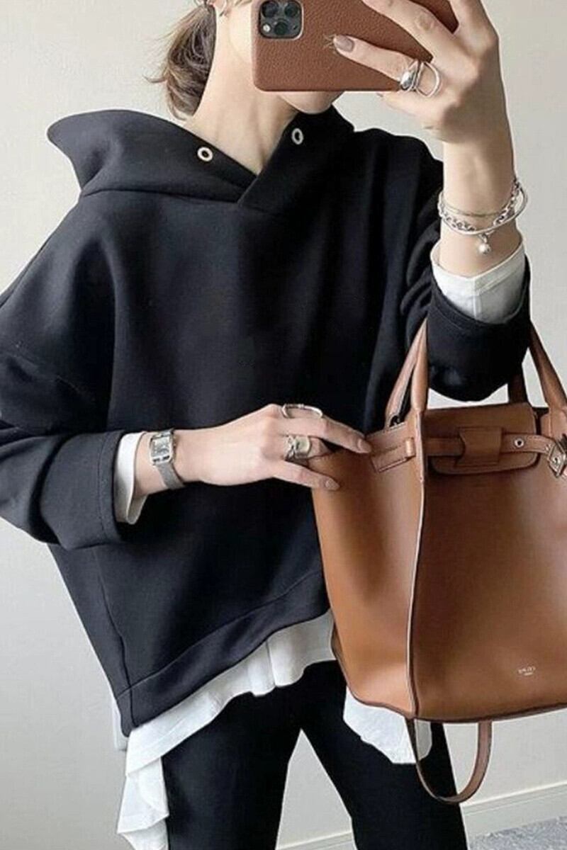 怠惰なスタイル無地トップス女性 2022 新しい秋のファッションカジュアル長袖ルーズ黒フード付きスウェットシャツ ロング ブラック オータム 秋物 ソリッドカラー cat83946517185
