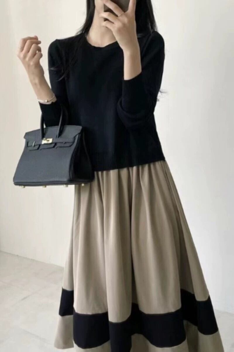 在庫あり 2023 新しいスタイルの婦人服ファッショナブルなカラーマッチングニットスプライシング長袖ロングドレス cat860455982758