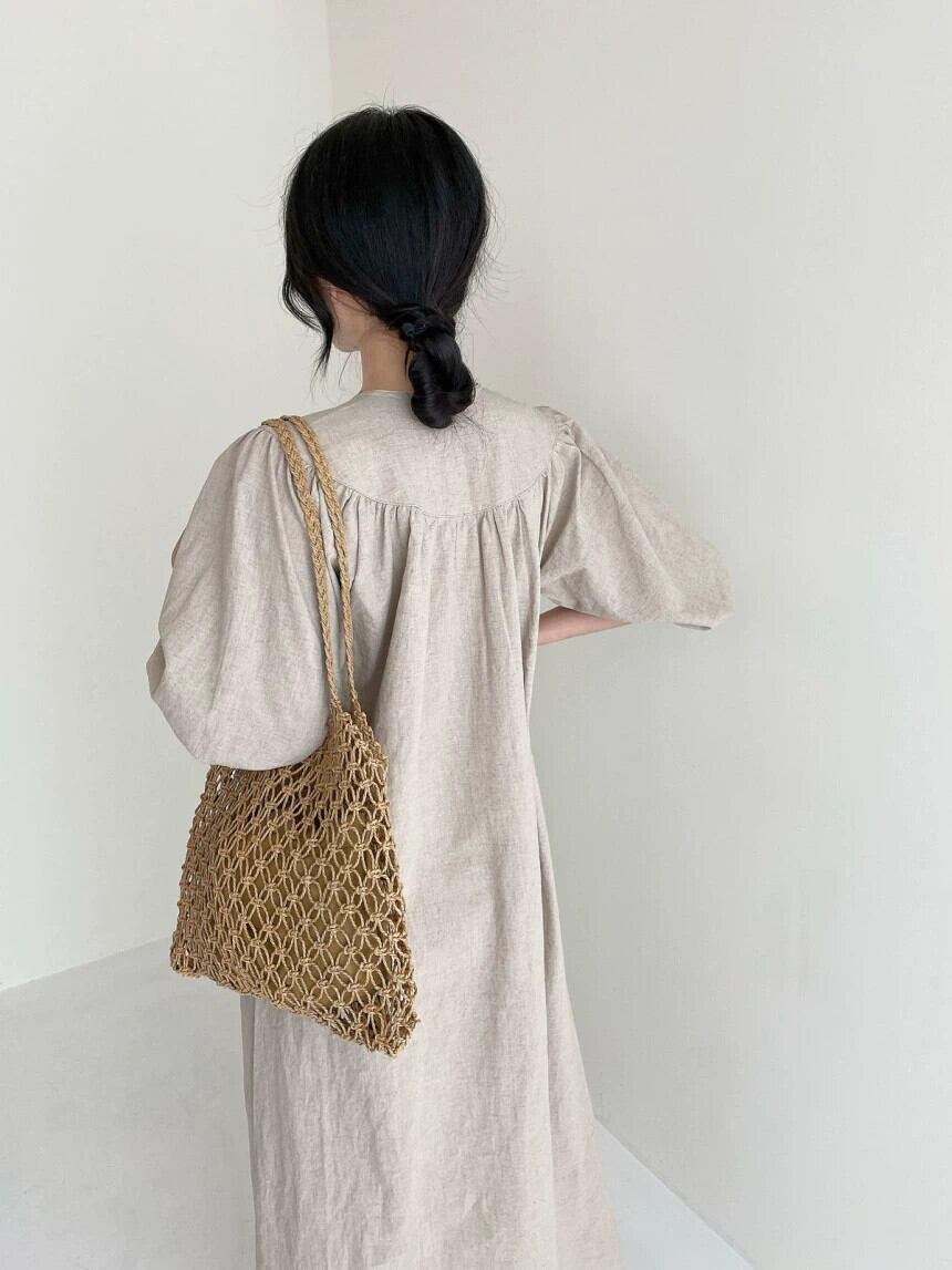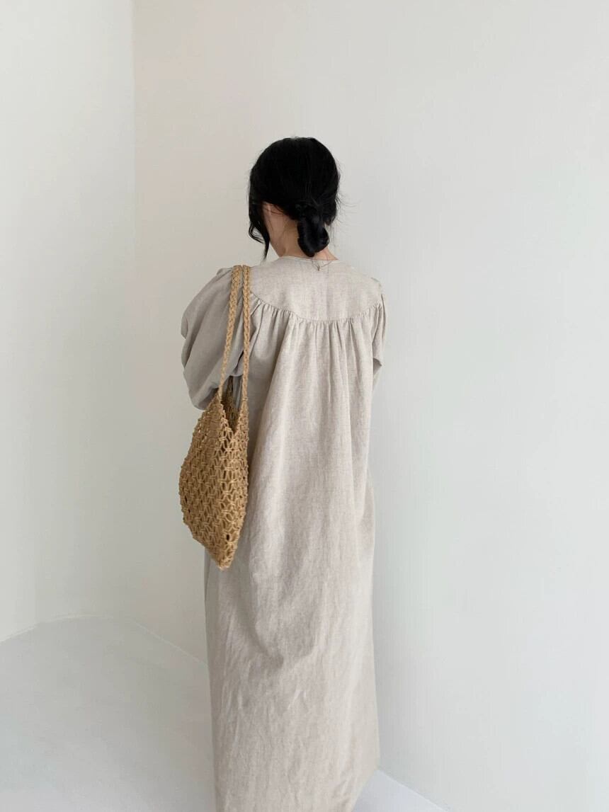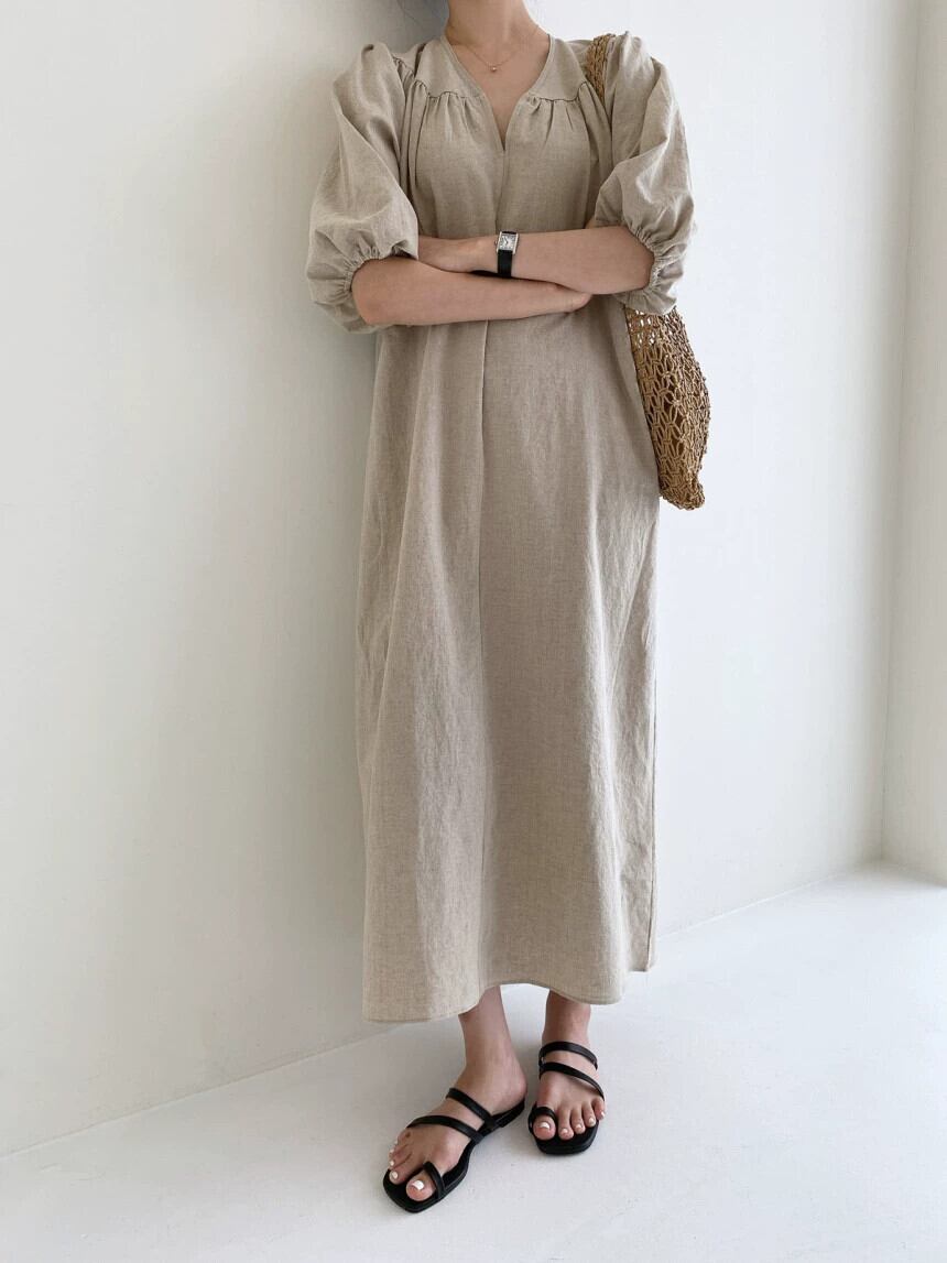 南の2021新しい夏スタイルシンプルなVネックパフスリーブ気質スリム綿麻ロングルーズ大きいサイズドレス コットン 大きめサイズ サマー 夏物 cat869129605869
