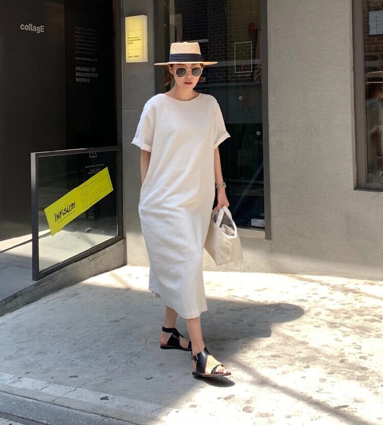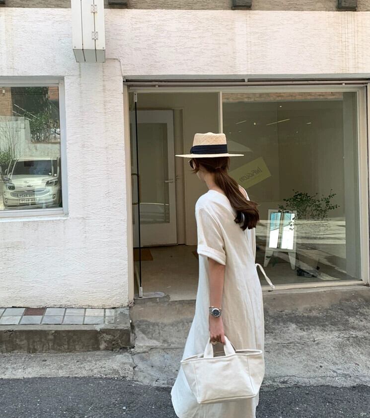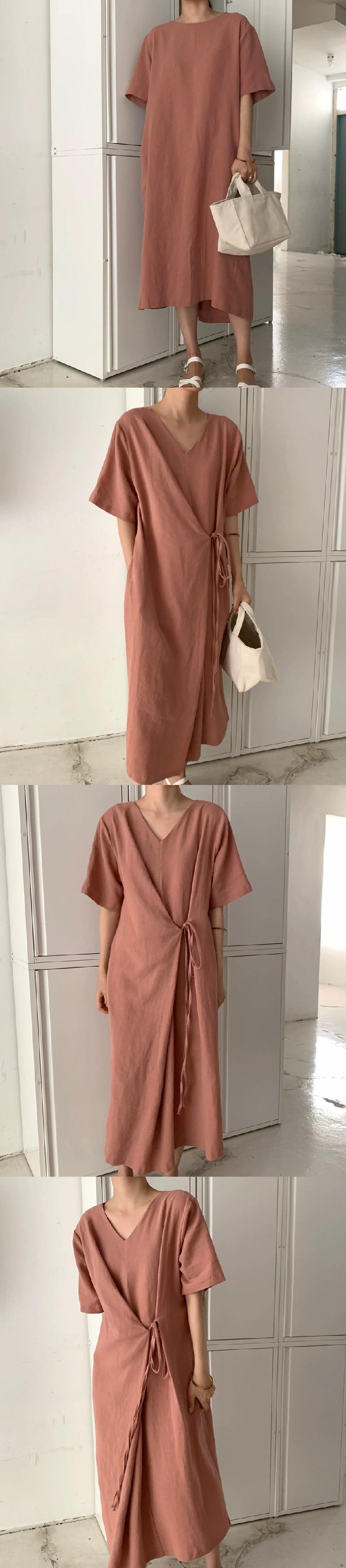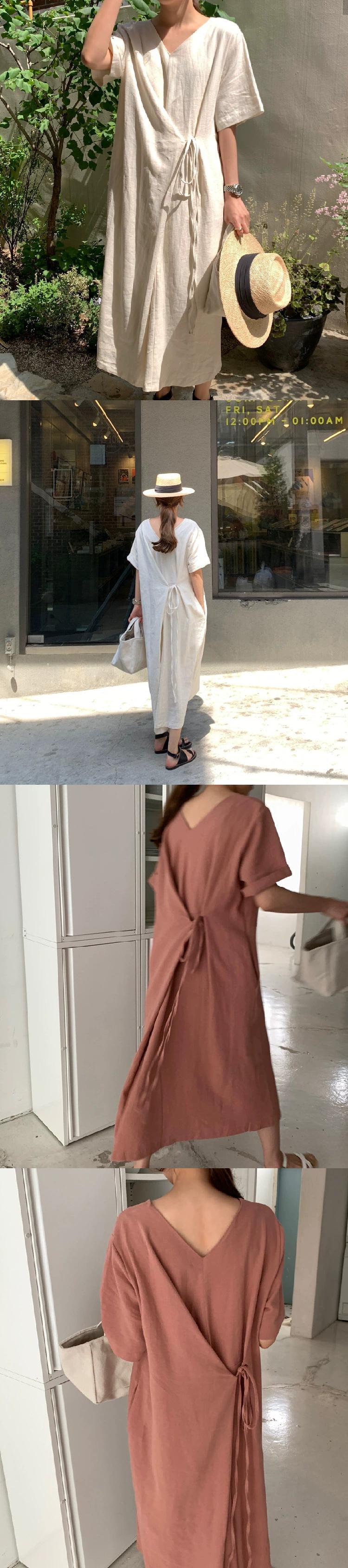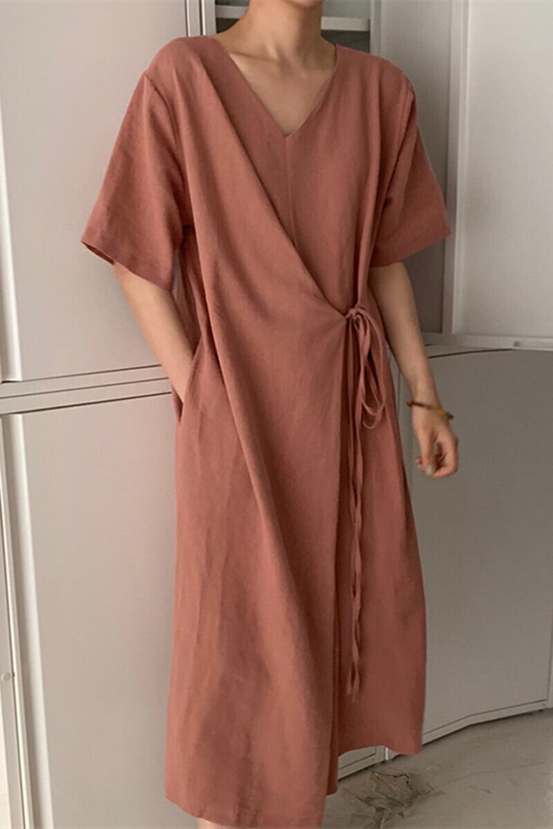 シックなレトロ怠惰なスタイル V ネック無地ルーズ前後 2 着レースアップミッドレングス半袖ドレスの女性 Vネック ソリッドカラー cat889103291652
