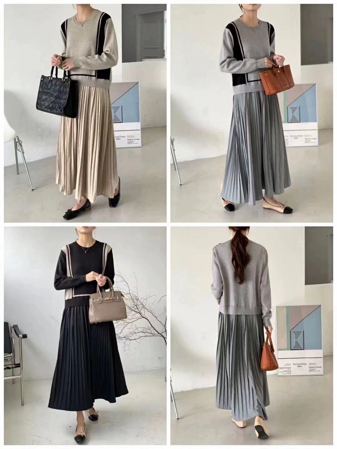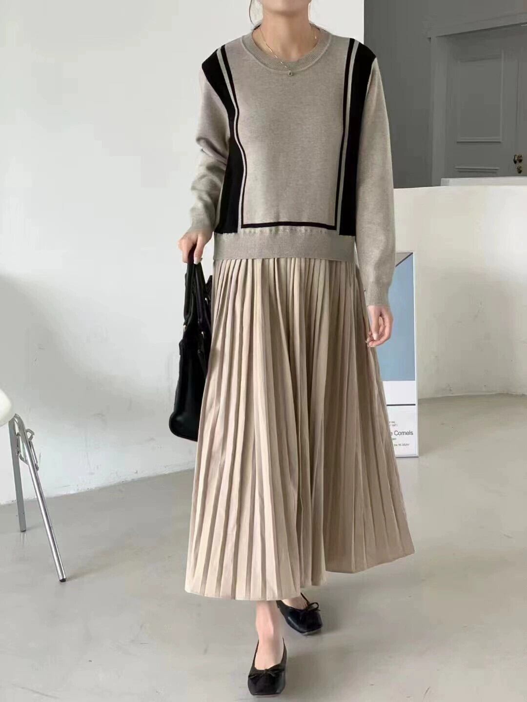 スポットスタイルラウンドネック長袖ニットスプライシングフェイクツーピースドレス ロング Oネック cat828638111220