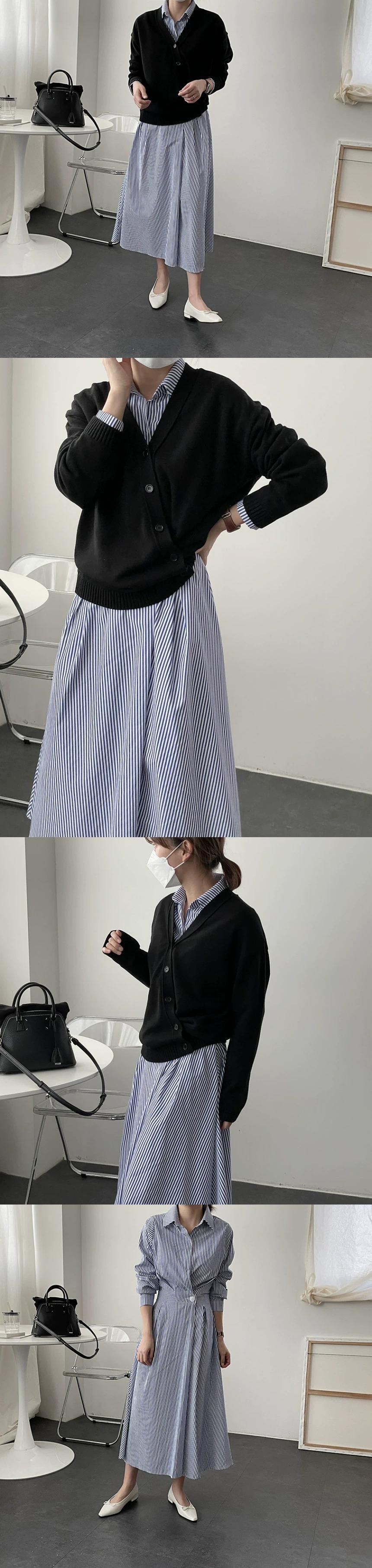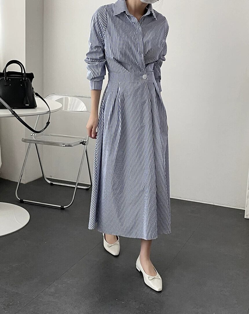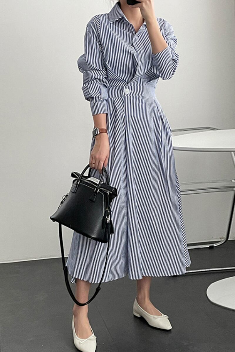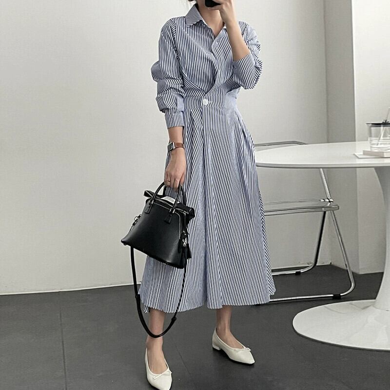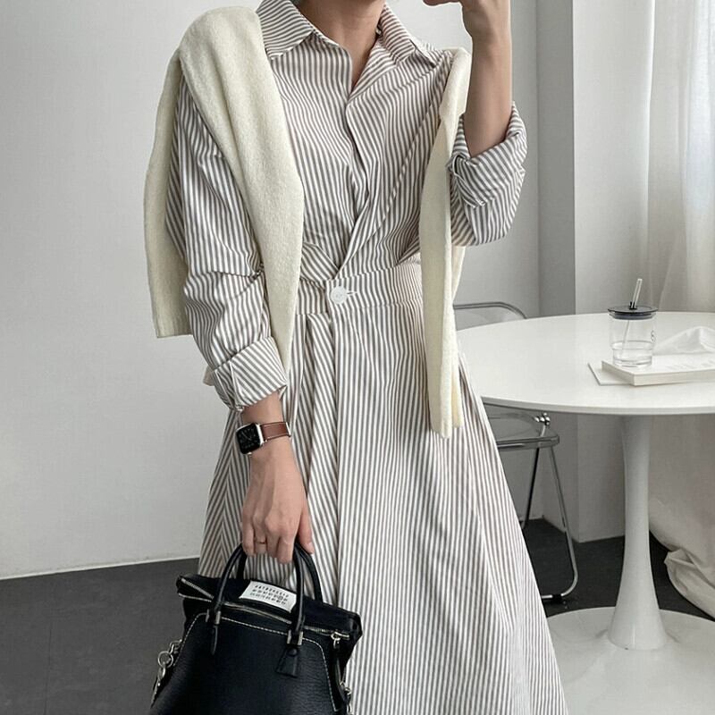 バージョン2021新しい秋スタイル軽くて成熟したスタイルラペルワンボタンウエストロングストライプシャツドレス女性 オータム 秋物 cat89607823837