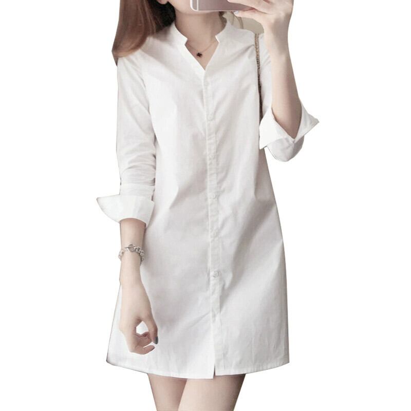 2022 春と秋の白シャツ女性のデザインニッチ長袖 V ネックミッドレングス純綿スリムフィットシャツドレス ロング ホワイト コットン スプリング 春物 オータム 秋物 Vネック ピュア cat815311054083