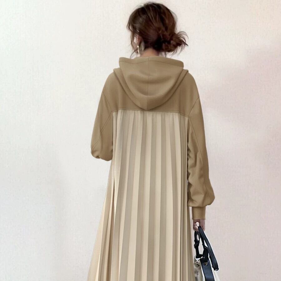 ese 秋 2023 新しい女性の冬のバックプリーツステッチ長袖ルーズフード付きスウェットシャツドレス ロング オータム 秋物 ウィンター 冬物 cat828116223484
