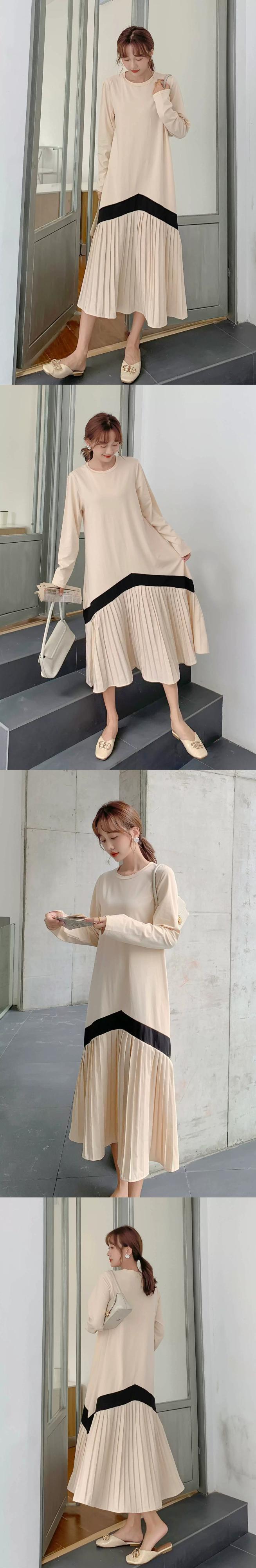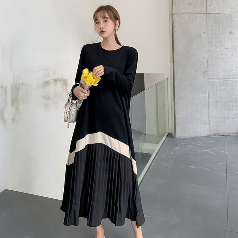 秋の新しいデザイナースタイルのプリーツスプライシングルーズ長袖ドレスの女性は、腹部をカバーし、膝の上にスリムダウンするミッドレングススカート ロング オータム 秋物 cat83504448264