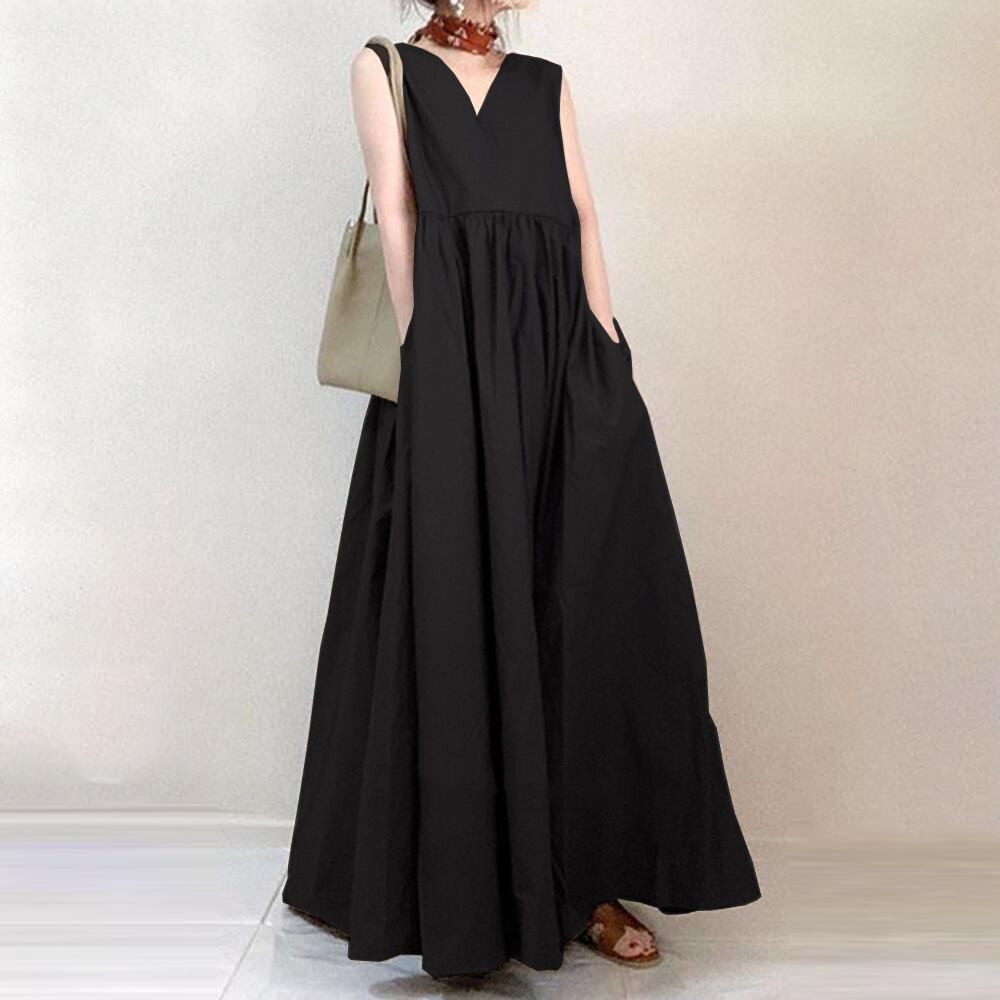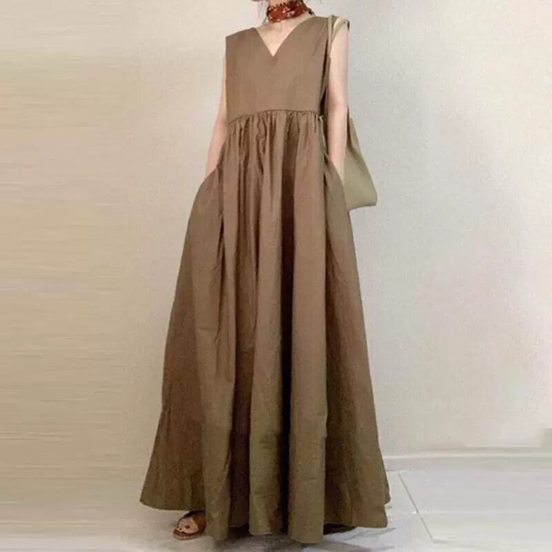 ソリッドカラー V ネックノースリーブドレスレディース、サマースタイル、ルーズ、ワイドスングベスト、ロングスカート、ファッショナブル、痩身、ハイウエストレトロスカート 夏物 Vネック cat83088717574