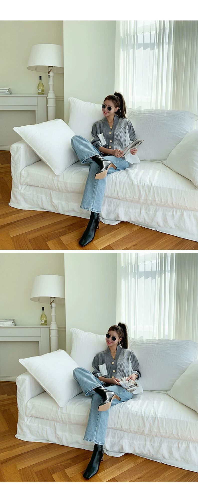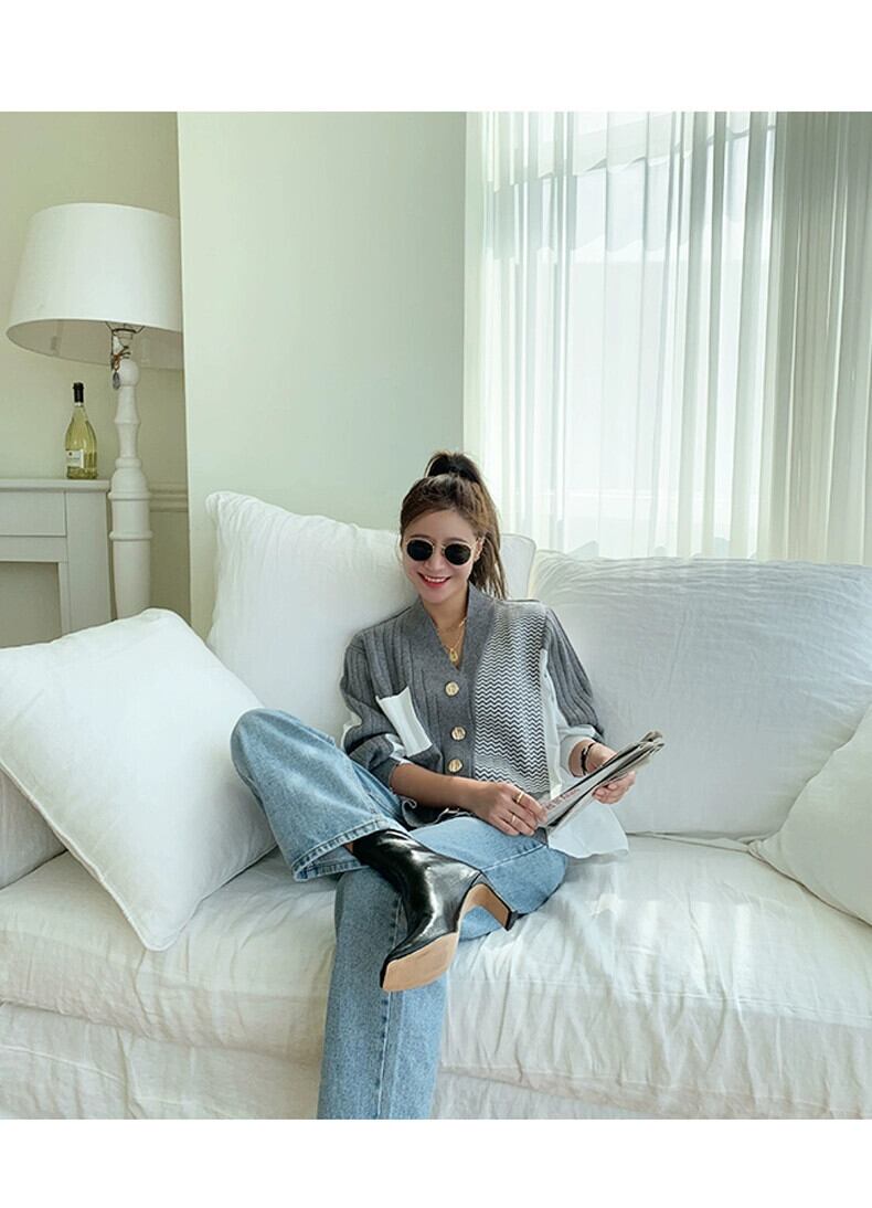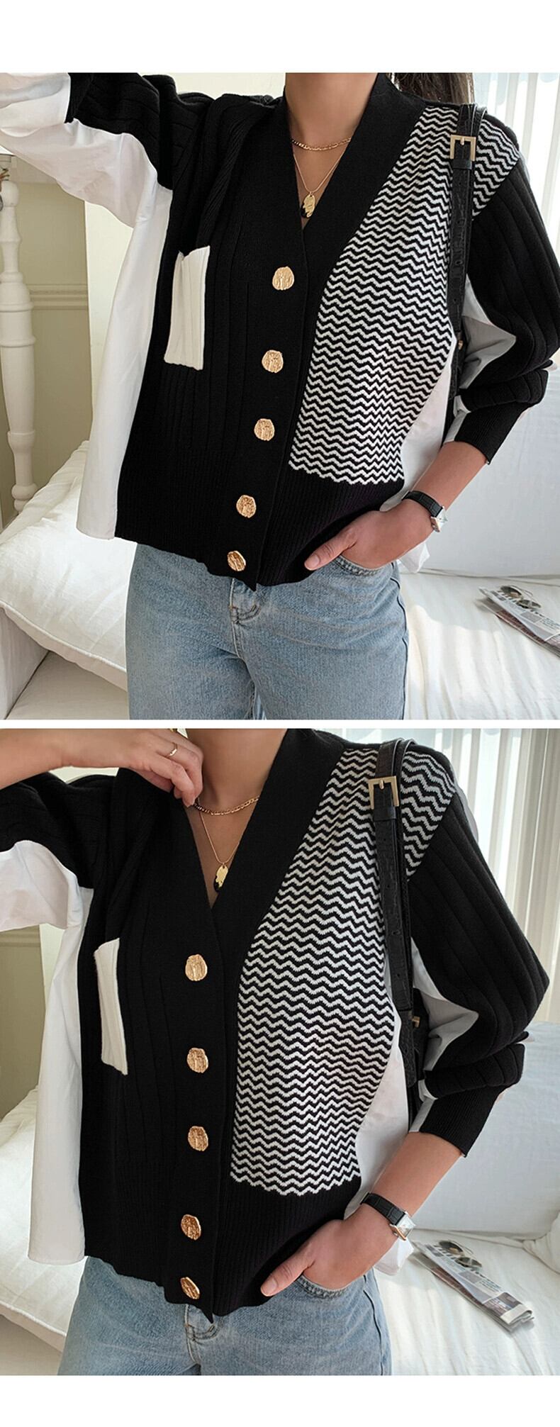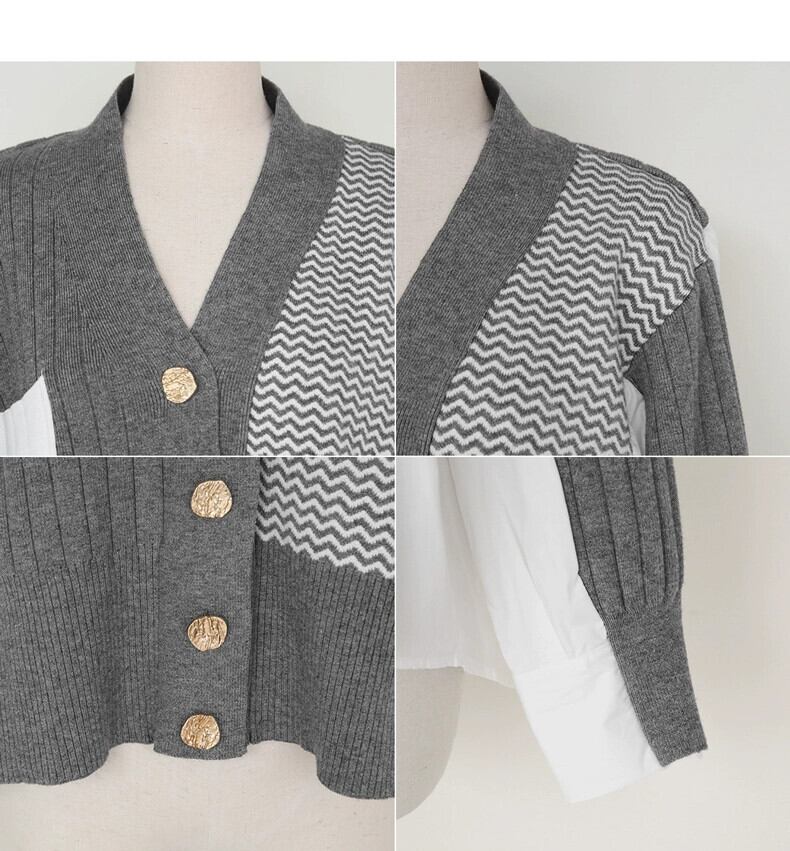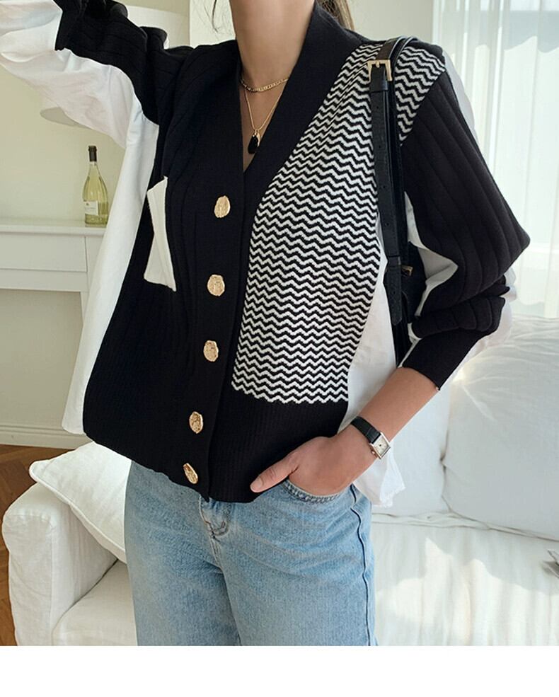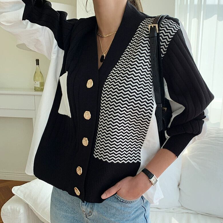 スタイル万能でゆったりとしたデザインのVネックシングルブレストダンボールパッチワークシャツ、シンプルでファッショナブルなニットカーディガン cat859413820749