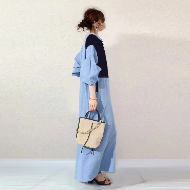 越境貿易の秋冬の新スタイルフェイクツーピースカラーマッチングルーズフィットスリムフリルスカートロングドレス オータム 秋物 ウィンター 冬物 cat828822802845