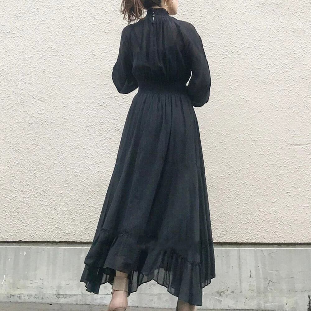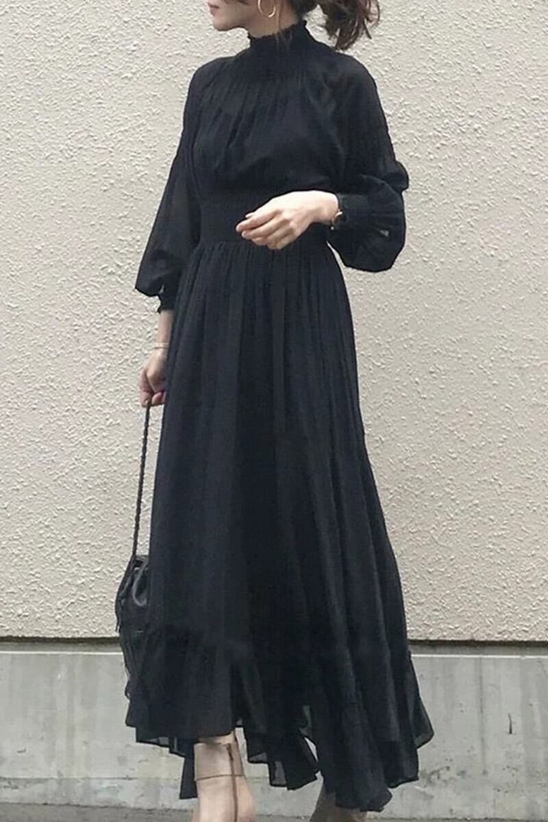 ese 2022 春の新スタイル気質ウエスト痩身ハイカラーフリルプリーツラージスカートドレスロングスカート女性 スプリング 春物 cat894585884082