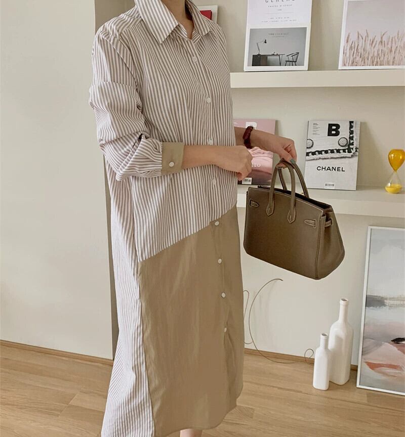 春と秋のスタイルのルーズ長袖ステッチコントラストストライプシャツドレスレディースロングスタイルスリムドレス スプリング 春物 オータム 秋物 cat861633103419