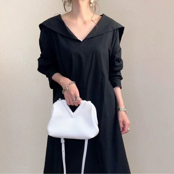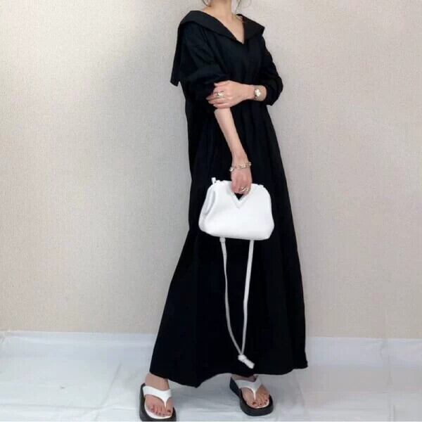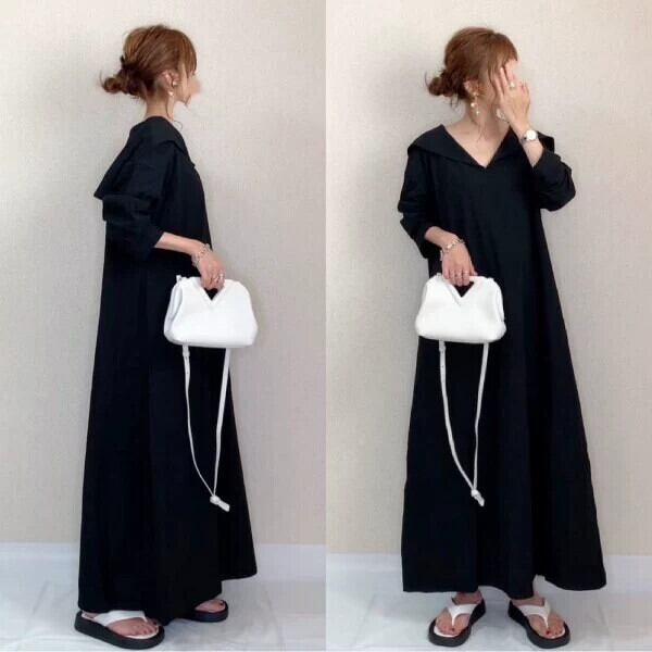 と南楽天秋の新しいファッションネイビーカラー黒長袖気質ゆったりとスリムなミドル丈ドレスの女性 ロング ブラック オータム 秋物 cat827543147671